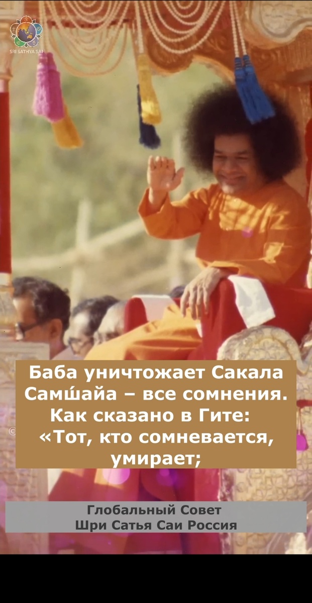 Баба говорит: «Вы доверяете своему водителю, когда едете в машине; вы доверяете инженеру, который её создал. Без доверия своему повару ваша жизнь будет сплошным мучением. Сомнения преследуют и устрашают. Они разрушают любовь; они ведут вас к погибели. Верьте в себя. Это начало вашей веры в Бога», – говорит Баба.