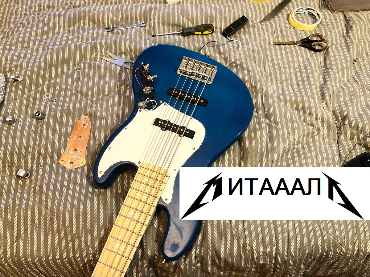 Привет, друзья. Сегодня у меня была интересная задача - переэкранировать бас-гитару, которую до меня уже экранировали, но что-то пошло не так. Это был китайский джазбас, который страшно фонил на дисторшне. На нём ну очень неудобно было играть металл. Вообще, конечно, бас с синглами выбирать для дисторшна - это исходный эпик фейл, но, в конце концов, если включить оба сингла сразу (когда они работают как 2 катушки хамбакера), то можно получить почти совсем тихую гитару. Будем исходить из этого. Владелец и его друг уже до меня что-то там поделали, так что давайте поглядим, что же ко мне пришло и в каком виде. Пайка. Видно, что очень старались, и даже не один раз пробовали. Правда, так замучали один потенциометр, что у него перестала контакчить одна из лапок. Проблема дешевых поцов - от перегрева или частого механического воздействия лапки начинают люфтить. Прижмёшь - есть контакт, отпустишь - уже нет. Экран. Обклеили всё, даже тыльную сторону металлической крышки тембрблока. Это, конечн