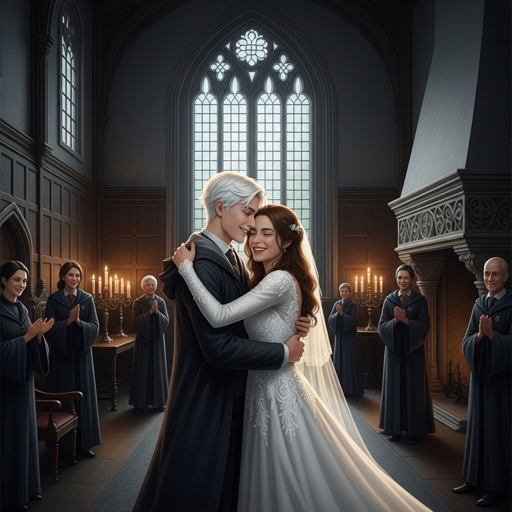 Глава 34 Свадьба была не такой, как представляют себе сказки. Она была тихой, скромной и проходила в саду Малфой-Мэнора, который по настоянию Нарциссы старательно очистили от самых мрачных и ядовитых растений. Гости собрались немногочисленные, но самые важные. Со стороны Гриффиндора, преодолев скепсис и предупреждения, пришли самые верные друзья. Гарри — с милой, тихой девушкой из Когтеврана, которая смотрела на него с обожанием. Рон — в сопровождении Джинни, его младшей сестры; другой пары для него пока не нашлось. Они стояли немного в стороне, чувствуя себя не в своей тарелке, но их присутствие говорило громче любых слов: они были здесь ради Гермионы. Из Слизеринцев не было никого. Лишь одинокий, мрачный силуэт Северуса Снейпа стоял в тени дуба, наблюдая за происходящим с привычной невозмутимостью. Он пришел как крестный отец Драко, и его присутствие было знаком глубокого, пусть и молчаливого, уважения. Но самое странное напряжение витало между ним и Нарциссой. Они обмен