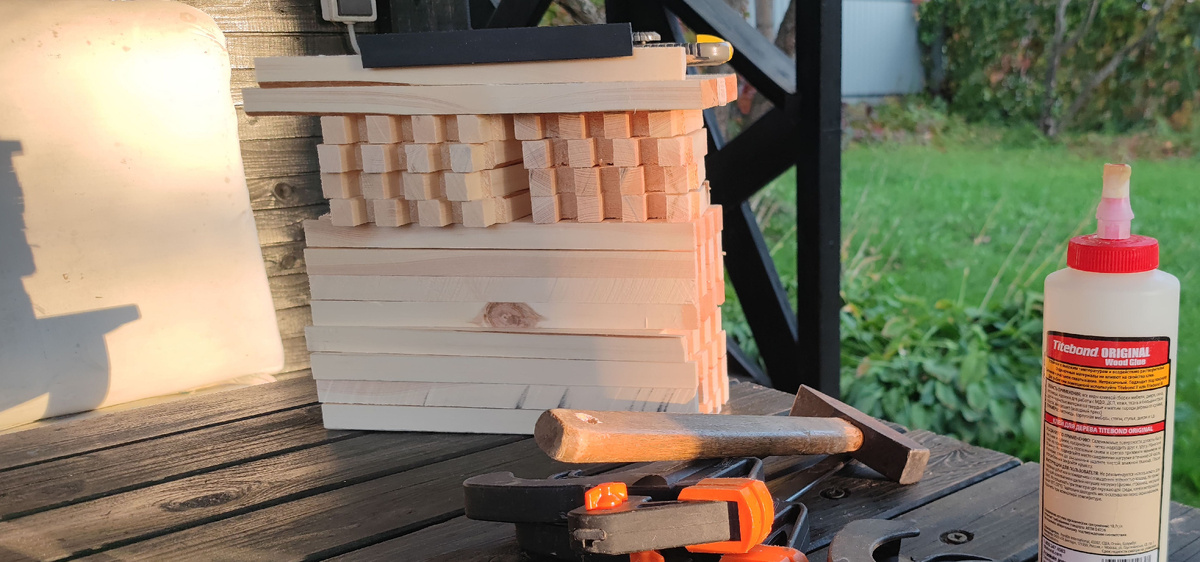 Полюбовавшись немногообновой, и еще не полностью потратив творческий заряд, решил конструкцию доработать и усложнить. Обрезков еще более чем достаточно. Крою еще дощечек, мажу клеем, формирую дополнительный элемент: