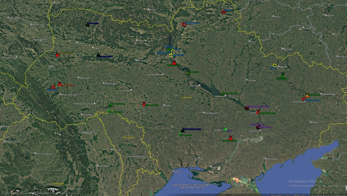 Как-то так. Основная генерация Украины. Красный значок - атакованы и не работают; Жёлтый/оранжевый - атакованы (предположительно), но работают; Зелёный - не атакованы. Название - напряжение: Синий - 750 кВ; Рыжий - 400 кВ; Зелёный - 330 кВ; Жёлтый - 220 кВ; Фиолетовый - 150 кВ; Голубой - 110 кВ.