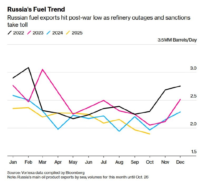 🇷🇺 Экспорт топлива из России достиг минимума с начала СВО За почти полный октябрь было поставлено всего 1,9 млн баррелей топлива, что на 5-15% меньше показателей за октябрь 2022-2024 годов. Причиной снижения стали сбои в работе НПЗ и ужесточение санкций, пишет Bloomberg. Особенно большое снижение показали отгрузки нафты и мазута. Сильное негативное влияние показали последние санкции против «Лукойла» и «Роснефти». Ограничения привели к изменению маршрутов платежей. А экспорт дизельного топлива остается достаточно стабильным из-за того, что идет в Турцию и Африку. Нафта и мазут направляются, в основном, в Азию. #ЭкономикаРФ @if_news