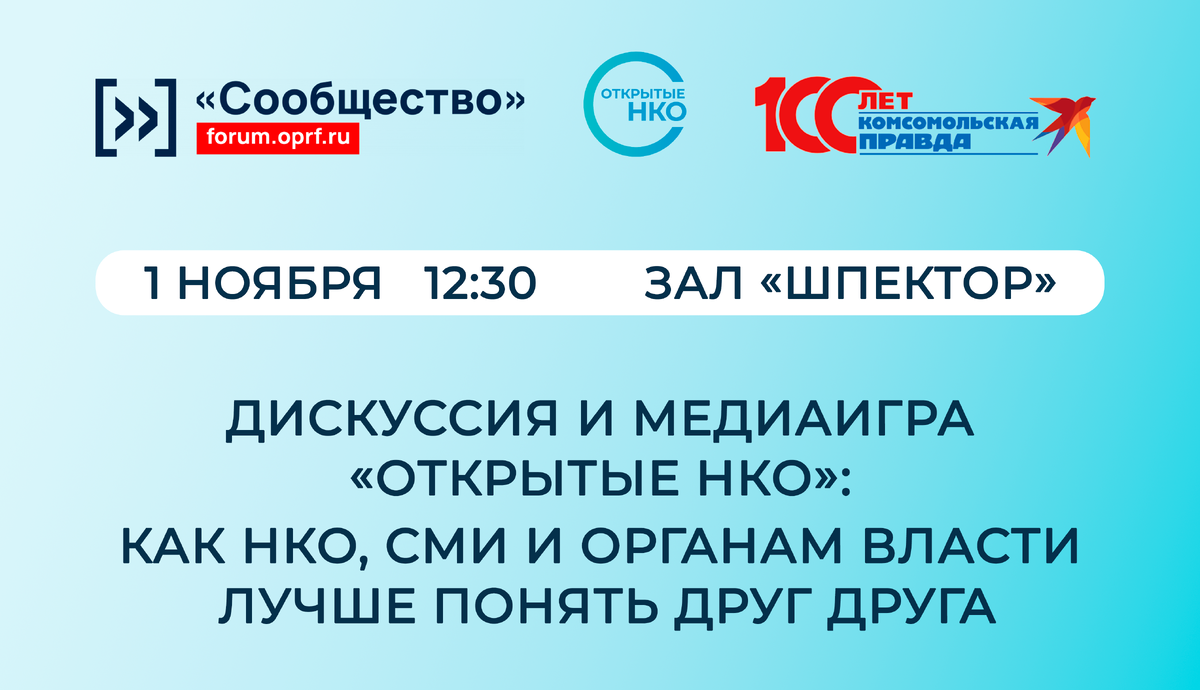 Ее проведет продюсер медиаплатформы dobro.live Анна Хороших. К участию приглашаются все желающие. В Москве в Национальном центре «Россия» (г. Москва, Краснопресненская наб., д. 14, стр. 18) состоится ключевое событие 20-летия Общественной палаты РФ — форум «Сообщество». Тема форума — «Институты гражданского общества: вчера, сегодня, завтра». Программа форума — по ссылке. 1 ноября в 12:30 команда проекта «Открытые НКО» и ИД «Комсомольская правда» организуют дискуссию и медиаигру «Открытые НКО»: как НКО, СМИ и органам власти лучше понять друг друга». - Главная цель — помочь лидерам некоммерческих организаций «выйти из тени», узнать об эффективных способах медиапродвижения, показать, что благотворительность — перспективная тема для СМИ. Это уникальный практический формат, где руководители НКО осваивают полный цикл работы с медиа через погружение в роли ключевых игроков медиасферы, рассказала руководитель социальных проектов Департамента стратегических коммуникаций Медиагруппы, продюсер Ме