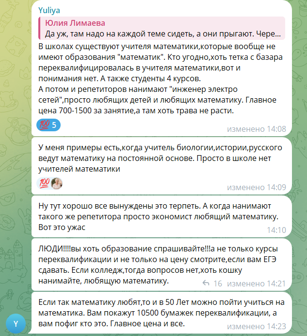 Повторюсь, на всякий случай: я не считаю, что бумажка определяет человека, и к учителям с соответствующим дипломом у меня предубеждения нет. Как бы ни старались многие обладатели данного диплома меня убедить в универсальности критерия "есть диплом - плохой учитель", я знаком и с обратными примерами. А это для тех, кто в ладах с логикой, называется контрпример - и он опровергает общее утверждение. С примерами, на которые ссылается Юлия из скринов начале статьи, я тоже знаком - кто только ни преподаёт в школах математику сегодня, и среди них попадаются персонажи похлеще самой Юлии - но все эти примеры не доказывают (очевидно ложного) утверждения, что "есть диплом - хороший учитель".