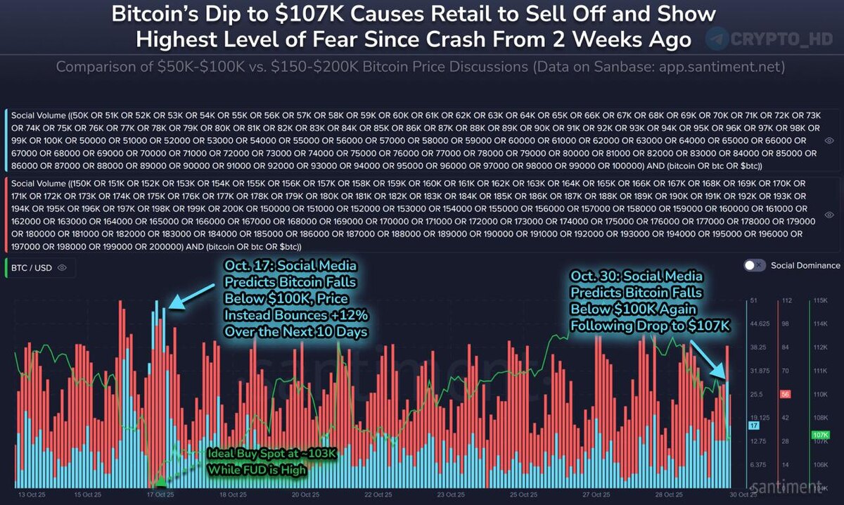 🐻 Аналитики Santiment предупреждают о FUD – толпа ожидает обвала Биткоина до $50,000-100,000.