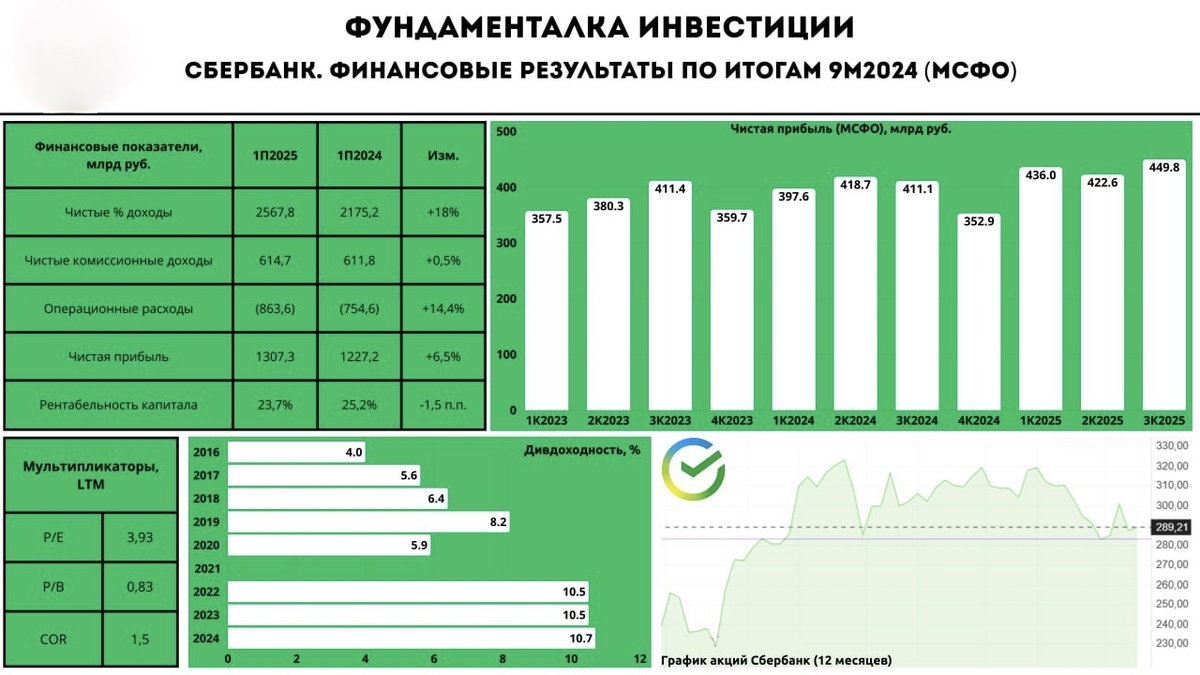 🏦 Сбербанк. Ожидаем рекордные дивиденды Вчера Сбербанк отчитался по МСФО за 9 месяцев 2025 года. Традиционно пройдемся по ключевым моментам отчета: - Чистые процентные доходы: 2567,8 (+18,0% г/г) - Чистые комиссионные доходы: 614,7 млрд руб (+0,5% г/г) - Чистая прибыль: 1307,3 млрд руб (+6,5% г/г) 📈 По итогам 9М2025 чистые процентные доходы выросли на 18% г/г - до 2567,8 млрд руб. за счёт роста доходности и объема работающих активов. Чистые комиссионные доходы в свою очередь показали минимальную динамику, прибавив всего 0,5% г/г - до 614,7 млрд руб. из-за давления высокой базы прошлого года. В результате чистая прибыль Сбера увеличилась на 6,5% г/г - до 1307,3 млрд руб. *Отдельно в 3К2025 Сбербанк заработал 448,3 млрд руб. чистой прибыли (+9,0% г/г), что является для компании новым рекордом. - рентабельность капитала (ROE) за 9М2025 составила 23,7%. - отдельно в 3К2025 чистая процентная маржа увеличилась до 6,17%. с 6,09% во 2К2025. - операционные расходы за 9М2025 выросли на 14