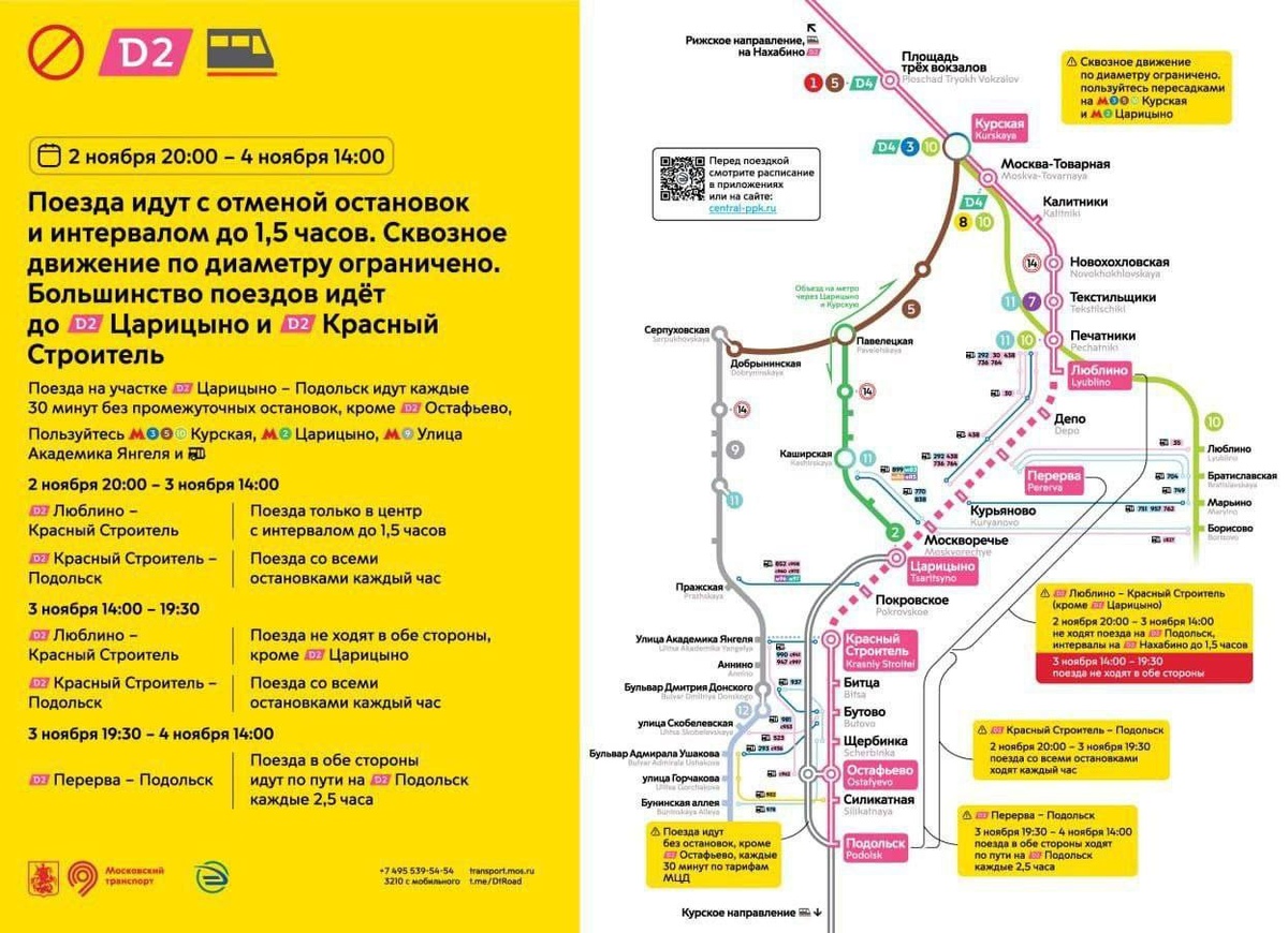 На МЦД-2 сильно изменится расписание движения. Ограничения вводят со 2 по 4 ноября из-за ремонта на путях - модернизируют станцию "Царицыно" и проведут капремонт пути на участке от "Щукинской" до "Красного Балтийца". Интервалы в движении поездов увеличатся, составы будут останавливаться не на всех станциях, поэтому в эти дни лучше на метро или автобусе - число рейсов наземного транспорта увеличат. Подробнее обо всем на схеме от Дептранса. 🚀Подпишись на Telegram канал Дрожжино
