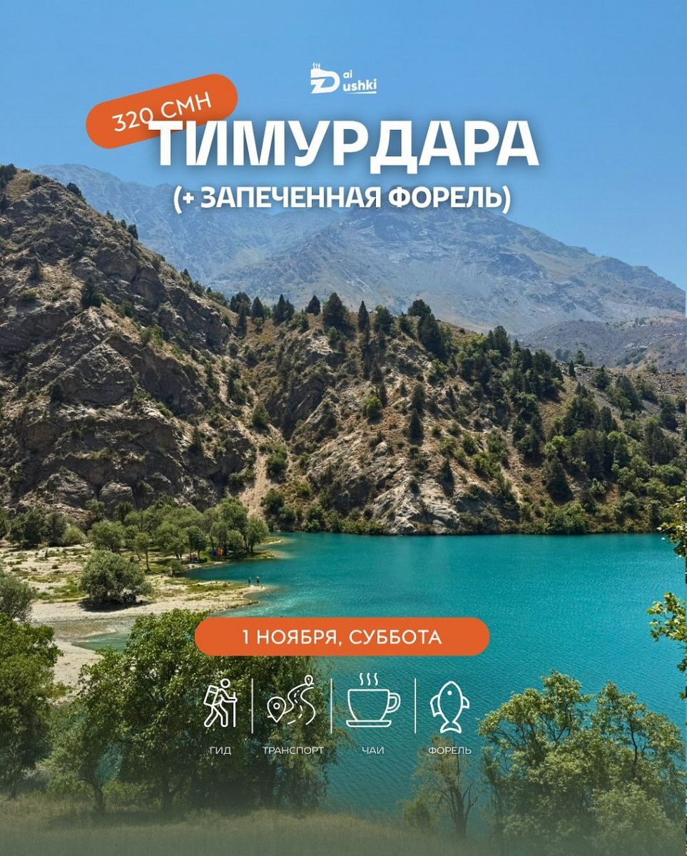 1 нояб, сб - Озеро Тимурдара + запеченная форель 🕔 6:00 - 19:00 💺 ДОСТУПНО: 10 мест 🥾 Сложность: 6/10 💳 320 сомони ✅ Включено: транспорт, гид, горячий чай, запеченная форель