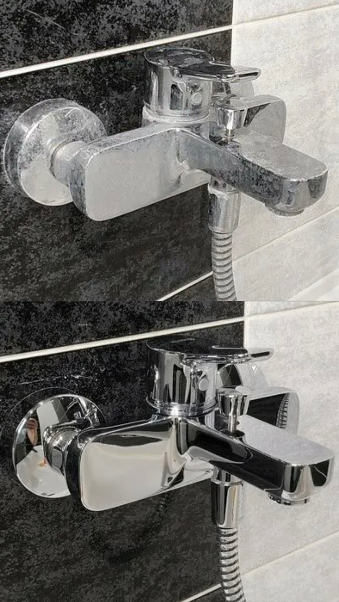 Решил проверить на себе один простой лайфхак для чистки кранов. Результат на фото — говорите сам за себя! ➖ ДО: Тусклый кран с разводами и известковым налетом. ➕ ПОСЛЕ: Идеальный блеск, как из магазина. Секрет — в простой пасте: 1. Смешайте обычную зубную пасту и пищевую соду в равных частях. 2. Нанесите на влажную поверхность, оставьте на 2-3 минуты. 3. Почистите старой зубной щеткой и смойте водой. Паста действует как мягкий полирующий абразив, а сода отлично растворяет налет. Способ бережный и не царапает поверхность! P.S. А вы какие домашние хитрости для уборки используете? Делитесь в комментариях — самые интересные способы испытаю и покажу в новых постах!