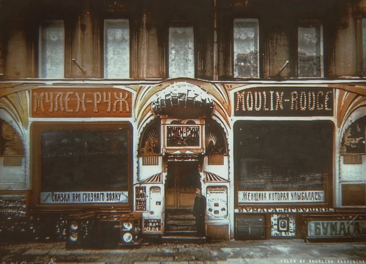 На снимке Карла Буллы после реконструкции цвета от Angelina Karpunina (color_byangelina) показан знаменитый кинотеатр «Мулен Руж» в доме № 51 по Невскому проспекту в Санкт-Петербурге. «Красную мельницу» (а так переводится название с французского) открыли в 1908 году предприниматели Н. В. Бурков и С. Э. Сасон. Кроме современного интерьера предприятие отличалось также инновационным подходом к трудоустройству работников. Персонал работал в две смены по полдня, получая при этом полное месячное жалованье. На фото показан кинотеатр, каким он был в 1913 года. Это ясно по афише фильма «Женщина, которая улыбалась», вышедшего в ту пору. Режиссером картины был Борис Чайковский (просто однофамилец).
