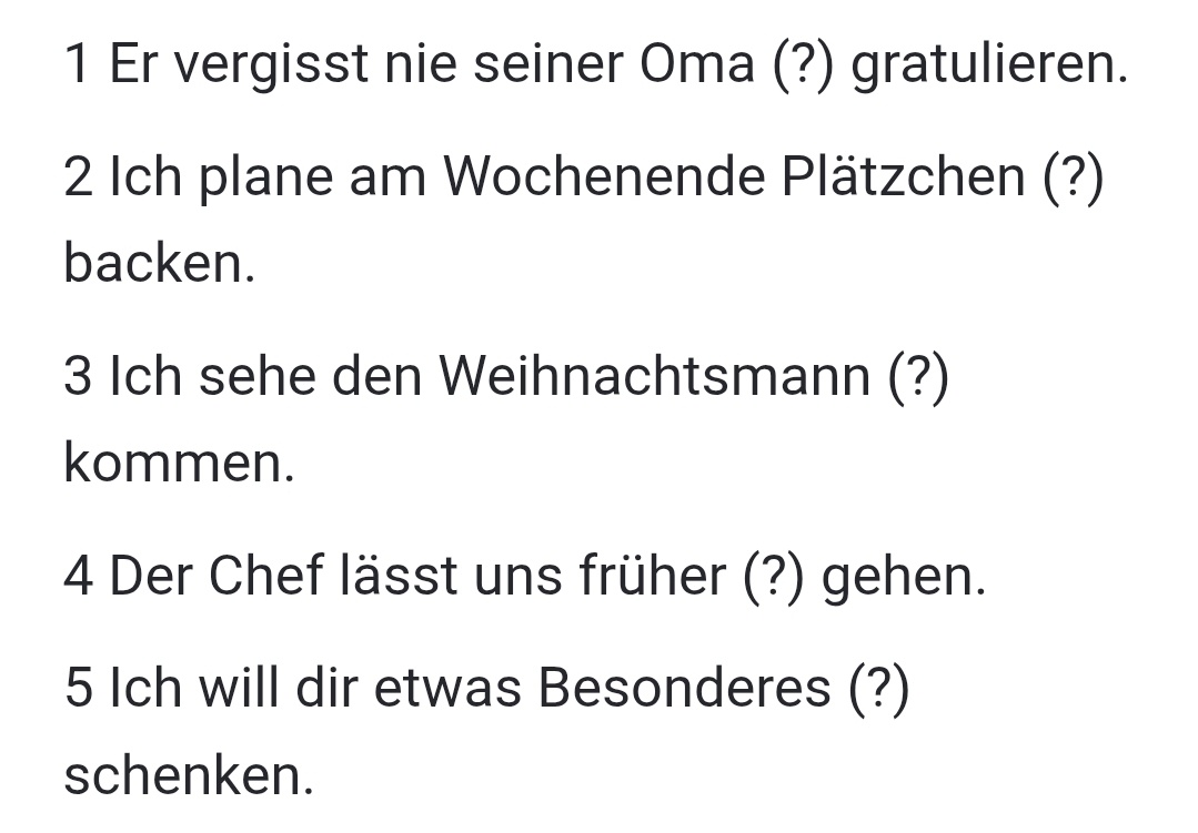 Готовьте глинтвейн и рождественское печенье, самое время взяться за загадочную и важную частицу немецкого языка – „zu“! В русском языке мы просто говорим: «Я собираюсь печь печенье». В немецком же перед вторым глаголом (инфинитивом) часто появляется этот маленький, но важный ингредиент – „zu“. Он как специя: и без него блюдо может быть съедобным, но с ним – просто шедевр! Давайте разберемся, когда же нам нужно добавлять эту „zu“, а когда ее следует оставить лежать на полке, чтобы не испортить вкус предложения. ❄️❄️❄️ ▎„Zu“ – Незваный гость (когда ее вежливо выпроваживают) Сначала поговорим о тех случаях, когда „zu“ чувствует себя лишней и ее нужно вежливо попросить удалиться. ▎1. Модальные глаголы – короли предложения! Это самая надежная группа исключений. Модальные глаголы (können, müssen, sollen, dürfen, wollen, mögen) – это короли. Они управляют всем, и инфинитив подчиняется им без всяких предлогов и частиц. Запомните: ПОСЛЕ модальных глаголов „zu“ НИКОГДА не ставится! • Ich kann de