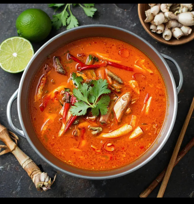 Том Ям — культовый острый и кисло-сладкий суп родом из Таиланда, который завоевал сердца гурманов всего мира своей яркостью вкуса и неповторимым ароматом. Чтобы приготовить этот кулинарный шедевр дома, следуйте простому рецепту ниже. Ингредиенты: Куриный бульон — 1 литр Креветки очищенные — 300 грамм Грибы шиитаке свежие или сушёные — 100 грамм Кокосовые сливки — 50 мл Перец чили свежий — 1 шт. Сок лайма свежевыжатый — от половины плода Листья лемонграсса — 2 стебля Галангал свежий нарезанный тонкими ломтиками — 2 см Имбирь свежий измельчённый — 1 чайная ложка Рыбий соус — 2 столовые ложки Кориандр свежая зелень — горсть Свежие помидоры черри — несколько штук Тайский базилик — небольшой пучок Инструкция приготовления: Подготовка ингредиентов: Если используете сухие грибы, предварительно замочите их в тёплой воде примерно на полчаса до набухания. Очистите креветки, оставив хвостик целым, и удалите жилку вдоль спинки. Обжарка специй: В кастрюле разогрейте немного рас