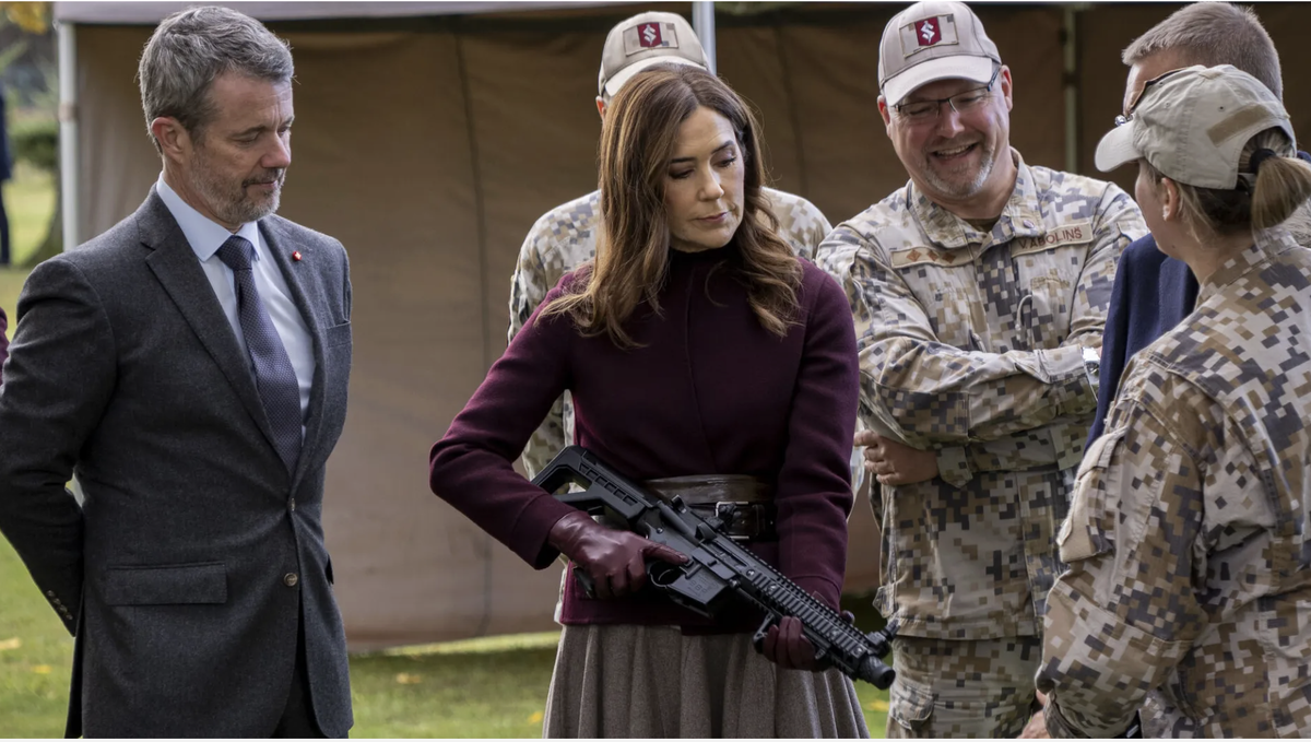 Датчане были слегка удивлены, когда увидели свою королеву Мэри с оружием в руках. Неужели 53-летняя королева снова пошла в аримию? Вроде как отслужила она своё в молодые годы, сейчас пребывает в звании "почётного майора". Нет, конечно. Просто их королевские величества сейчас находятся в Латвии с оффициальным визитом и их пригласили в учебное заведение, где латышские школьники проходят курс гражданской обороны. То есть начальную военную подготовку - фактически НВП. Здесь я хочу напомнить вам, что недавно датчане выпустили фильм, который снял Паша с Карабаша, о нем я писала здесь: А это- кадр из Пашиного фильма: Вы уже догадались, как на западе интерпретируют этот кадр. Теперь сравните с фотографией королевыт Мэри. Мне кажется, что это одно и то же, но какие разные пояснения! Королева Мэри, как всегда, продемонстрировала свои наряды. Вот король и королева направляются на церемонию приема. Заметим, что в Латвии сейчас не жарко, однако на королеве всего лишь туфли с тоненькими кол