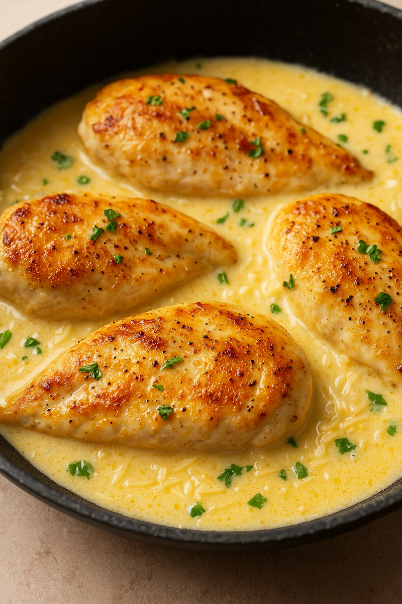 Этот ужин получается нежным, ароматным и буквально тает во рту. Минимум времени, простые продукты — а результат ресторанного уровня. Главный секрет сочности — не пересушить мясо и приготовить его в соусе, а не отдельно. Сливки и сыр создают ту самую кремовую текстуру, которая делает даже самое постное филе нежным. Идеально подходит для ужина, когда хочется чего-то домашнего, но без лишних хлопот. Промойте филе, обсушите бумажным полотенцем. Разрежьте каждую грудку вдоль — получится 4 тонких кусочка. Это ускорит обжаривание и поможет сохранить сочность. Посолите, поперчите, можно слегка приправить паприкой. На сковороде разогрейте растительное и сливочное масло. Обжарьте грудку по 2–3 минуты с каждой стороны на среднем огне до золотистой корочки. Не передерживайте — мясо дойдёт до готовности позже в соусе. Уменьшите огонь, добавьте мелко нарезанный чеснок, обжарьте буквально 20–30 секунд, чтобы не горел. Влейте сливки, перемешайте, дайте прогреться. Затем добавьте натёртый сыр и поме