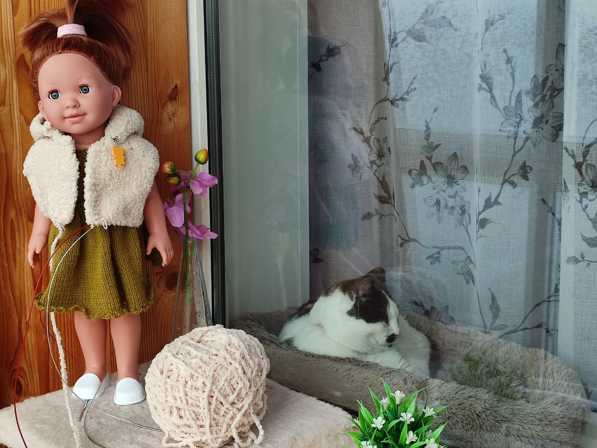 Что-то вдруг температура. Небольшая, но противная. Мартышечка приходит лечить. Она мой верный диагност. Если пришла, легла и обняла, как родную, значит что-то со мной не то. Решила проверить. Сунула градусник и таки да. Целый день валялась, вязала шубку Рыжику. Хотела вязать на маленькую, но промахнулась с плотностью и уже от капюшона делала свои расчёты по реглану. К сожалению довязала, когда было уже совсем темно и при нормальном свете сфотографировать не успела. Сказать, что я довольна на 100 % не могу. Нормально. Для первого раза. Вязала из какой-то новой пряжи. Она потолще, чем Alize Softy. И моточки по 100 грамм. Взвесила остаток, получилось 22 грамма, 78 ушло на длинную шубку с капюшоном для куклы 45 сантиметров. Ну вдруг кому-то информация будет полезна. Вязала на спицах 2,25. А это при свете дня кардиган с брюками на модели сфотографировала. Шастала по балкону, ещё не знала про температуру) На этом сегодня и всё. К вечеру начало ломать и уже хочется выпить горячего чаю