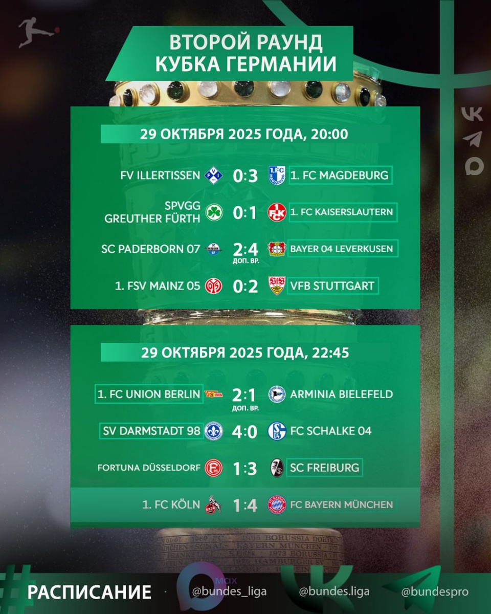 Результаты второго дня матчей Кубка Германии 🏆 2-й раунд «Иллертиссен» — «Магдебург» 0:3 «Гройтер» — «Кайзерслаутерн» 0:1 «Падерборн 07» — «Байер 04» 2:4 «Майнц» — «Штутгарт» 0:2 «Дармштадт 98» — «Шальке 04» 4:0 «Фортуна Д» — «Фрайбург» 1:3 «Унион Берлин» — «Арминия Билефельд» 2:1 «Кёльн» — «Бавария» 1:4 - Клубы Бундеслиги идут дальше: 🔟 - Клубы низших лиг Германии идут дальше: 6️⃣ ⭐️ MAX /// Видео+ ❤ Телеграм /// Аналитика+ ✅️ Флагманская /// Новости+