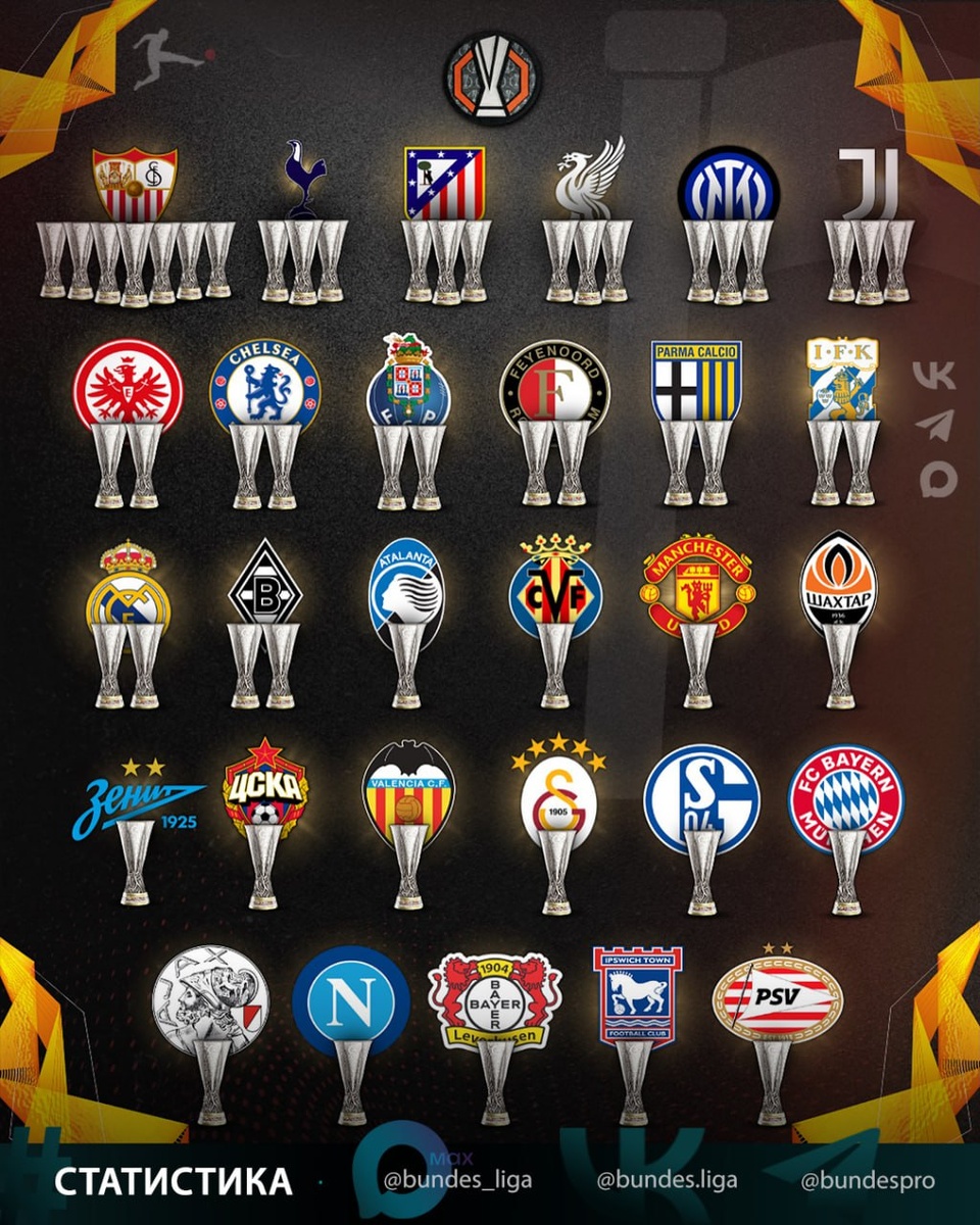 🏆 Все победители Лиги Европы/Кубка УЕФА за всю историю. Клубы, которые брали Кубок более 2-х раз: 👑 «Севилья» — 7 побед (2006, 2007, 2014, 2015, 2016, 2020, 2023); «Интер Милан» — 3 победы (1991, 1994, 1998); «Тоттенхэм Хотспур» — 3 победы (1972, 1984, 2025); «Ливерпуль» — 3 победы (1973, 1976, 2001); «Ювентус» — 3 победы (1977, 1990, 1993); «Атлетико Мадрид» — 3 победы (2010, 2012, 2018); ⭐️ MAX /// Видео+ ❤ Телеграм /// Аналитика+ ✅️ Флагманская /// Новости+