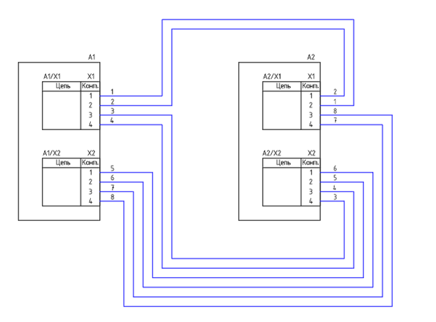 Имеется схема, состоящая из двух плат А1 и А2. На каждой плате установлено 2 разъема Х1 и Х2. Каждая плата – это родительский компонент, состоящий только из атрибутов. Прямоугольник контура платы создается командой AutoCAD и при необходимости легко редактируется. Каждый разъем – это дочерний компонент. Поз. обозначение разъема имеет следующий формат: поз. обозначение платы / поз. обозначение соединителя, например, А1/Х1. Это скрытый атрибут. Для обозначений разъемов используется атрибут DESC1 – Описание строка1. После размещения плат и разъемов построены соединения и пронумерованы. Добавлены копии номеров проводов. По схеме сформирован отчет Кабельный журнал. Таблица – отчет размещена на листе. Я 🩷AutoCAD Electrical !