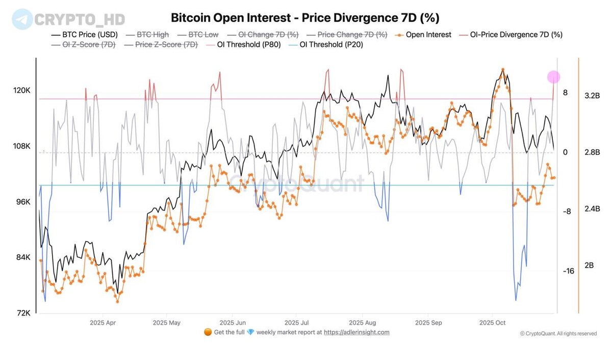 Метрика OI-Price Divergence 7D (%) указывает на критический дисбаланс между открытым интересом и стоимостью BTC.