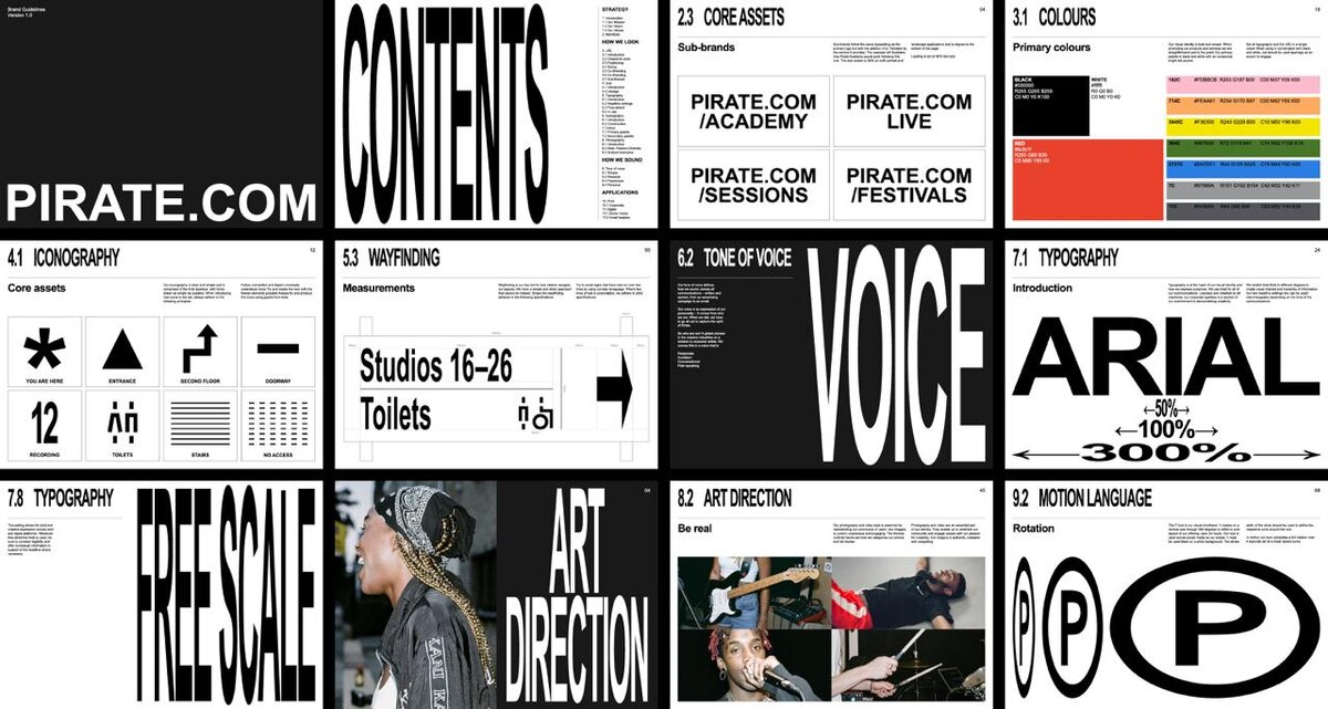 Шрифт Arial в айдентике компании Pirate.com, сеть студий для звукозаписей, танцев, записи подкастов и прочего