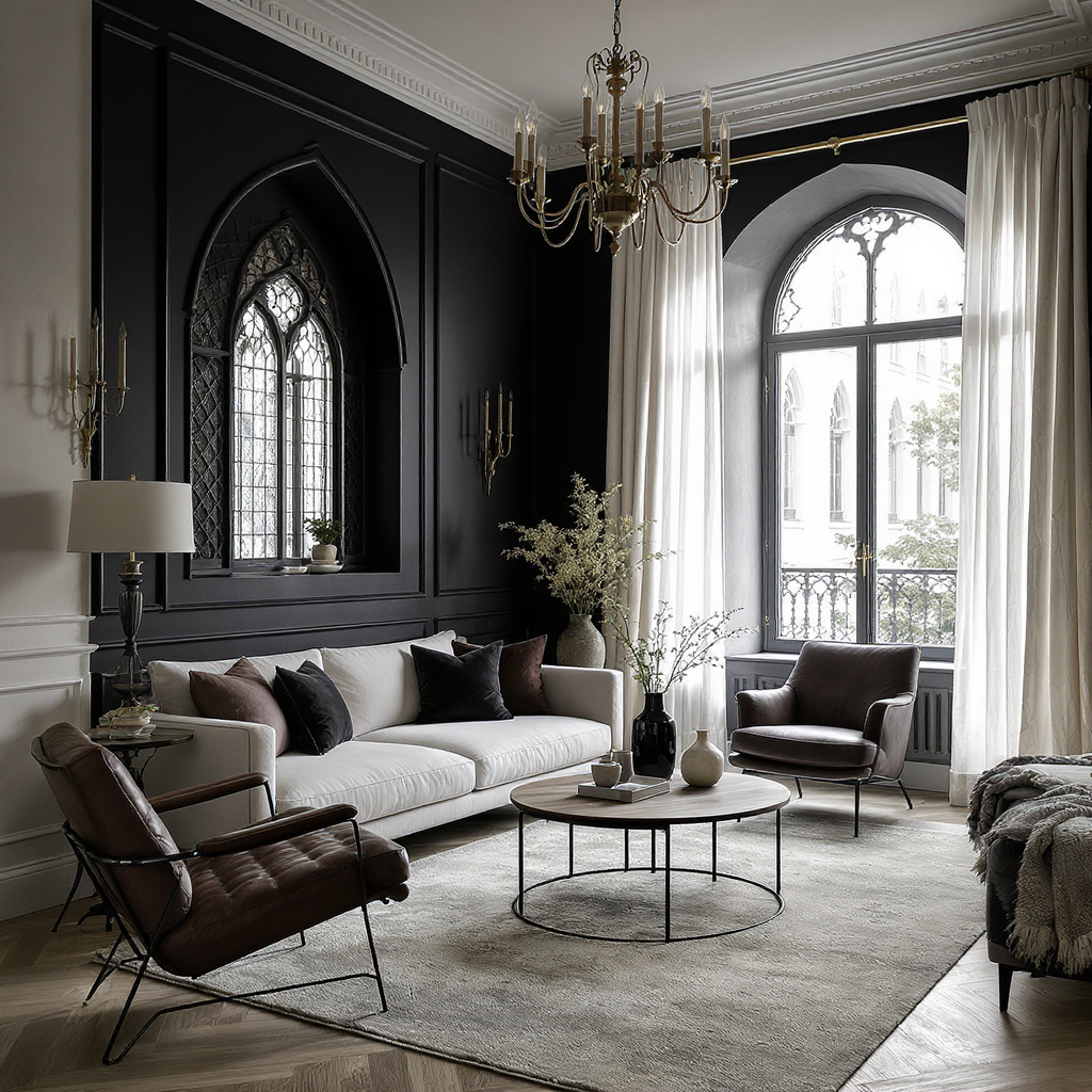 Пространство с лаконичными и простыми формами, в нейтральной цветовой гамме, дополненные точечными готическими акцентами — такими как резные деревянные детали, кованые элементы, стрельчатые арки и витражи. Такой стиль сочетает чистоту и минимализм с таинственностью и историческим духом готики, избегая перегрузки и сохраняя ощущение воздуха и простора, что позволяет интегрировать готические мотивы в современный интерьер без чрезмерной мрачности.