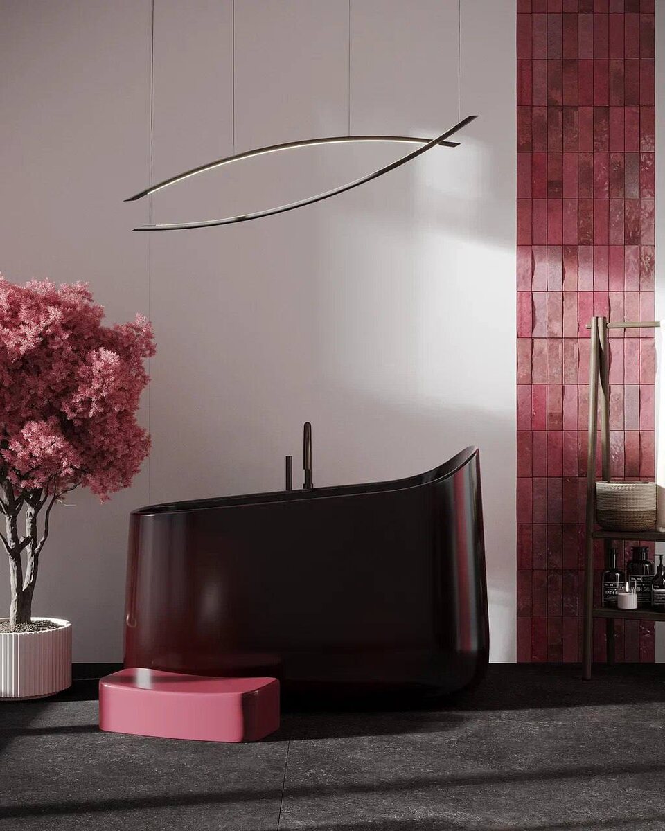 Salini. Интерьер, вдохновлённый японской философией ваби-саби, создает атмосферу спокойствия и гармонии, идеально подходящую для неспешного ритуала очищения тела и души. — Сердце композиции — коллекция Oriente в насыщенном тёмно-вишнёвом оттенке. Изящная купель Oriente Ofuro и напольная раковина Oriente Totem превращают повседневные водные процедуры в настоящие дзен-медитации. Хотите узнать подробнее? ▫️Звоните нам📲 +7(495)120-67-77 #salini #сантехника #bathroom #designbathroom