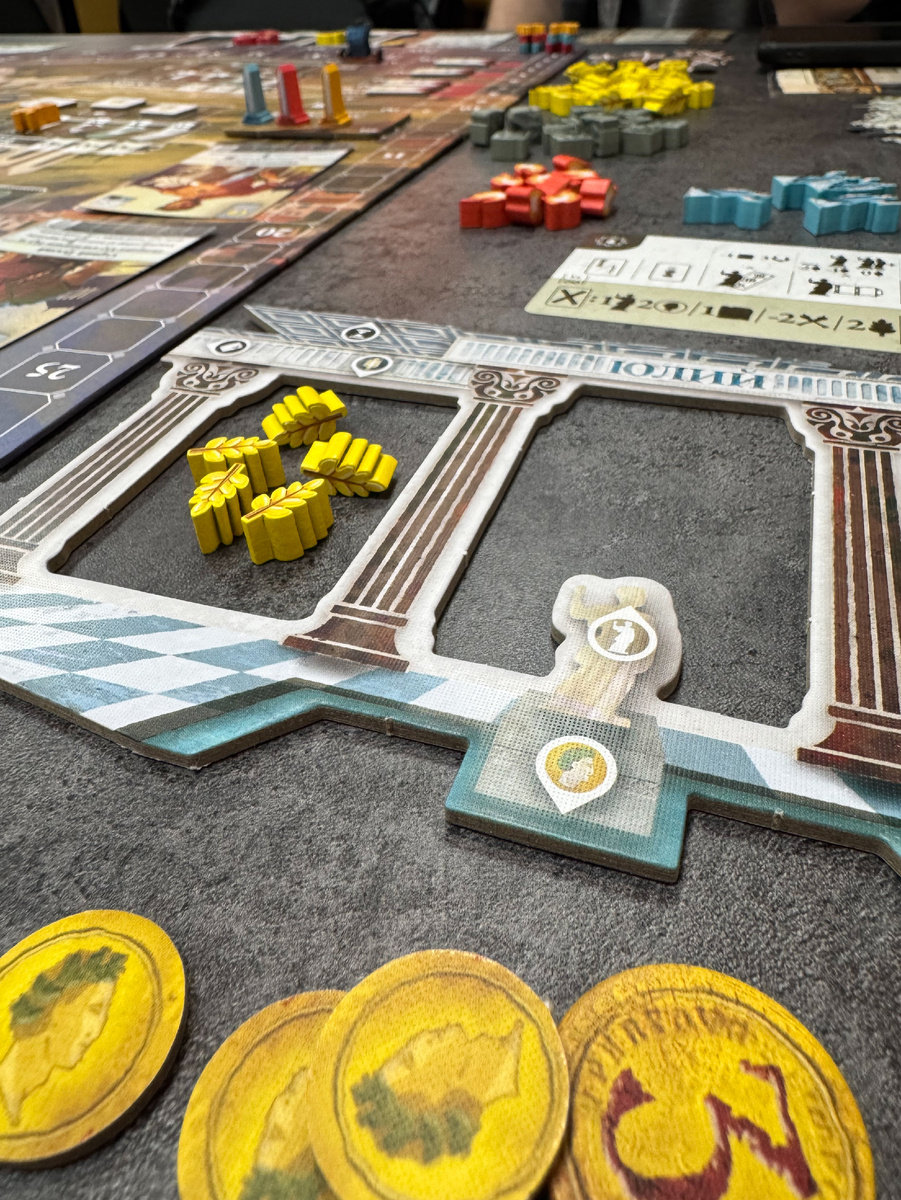 «Вечный город» издалека казался мне довольно быстрой и несложной игрой — и вроде бы правда: сами правила довольно стройные и не особо-то вариативные по числу действий (вообще по числу ресурсов и доступным действиям чем-то похоже на Фельда и «Брюгге»), но игра из-за своей кризисности может хорошо так загонять игроков в тупик, что и произошло у нас в какой-то момент с Ксюшей: из-за неудачного хода она осталась без ресурсов, и реабилитация после штрафов на треке восстания была для неё максимально болезненной.