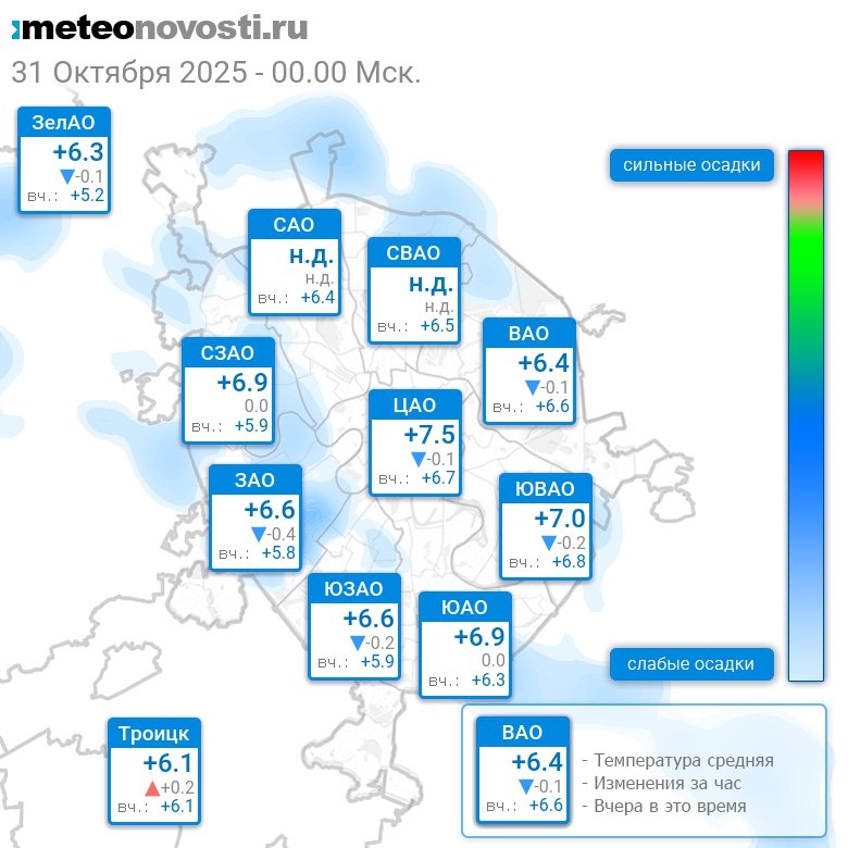 В 0:00 в Москве было от +6°C до +7.4°C, средняя температура +6.6°C #погода #Москва #осень #температура #31октября #пятница
