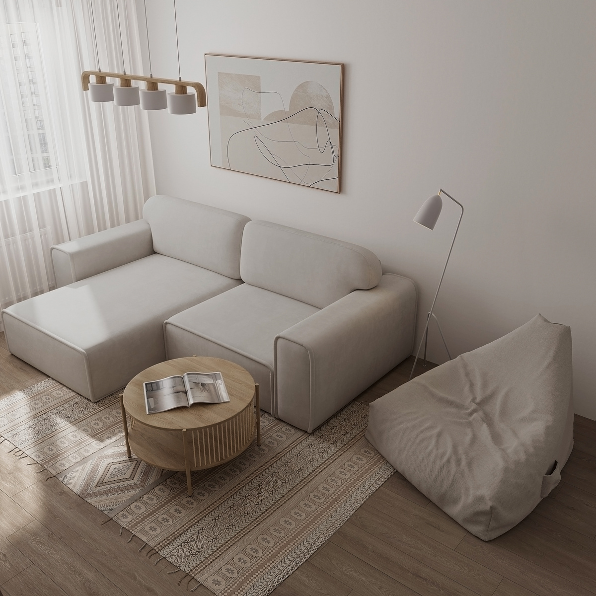 Ровное белое полотно отражает свет от панорамных окон, создавая ощущение высоты.