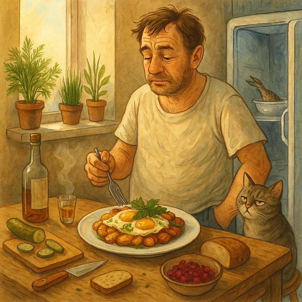 Поставил на стол тарелку и вновь залюбовался полученным. Не Италия, но так же красиво! Не пицца, но вкусно выглядит. На стул влезла кошка и застыла в недоумении. Она привыкла, что мои мужские блюда выглядят проще, но пахнут более притягательно. Сейчас же блюдо ввело ее в ступор. Красиво, но пахнет не очень… Лук? Розмарин? Не очень думая, что не понравилось моему шерстяному другу, я налил и выпил. Захрустев свежим огурчиком, я взял вилку и задержал её на высоте, боясь нарушить красоту и гармонию. Со стороны я наверное был похож на Нептуна, в руке которого был трезубец и он его занес, пытаясь осуществить свое божественное право - наказывать. Но рюмка выдавала, что я просто сел завтракать. И мне сейчас будет хорошо. Может, даже лучше, чем вчера. Но сравнение я смогу сделать только через полчаса, когда вчерашнее начнет оживить картинками и проясниться мой мозг.