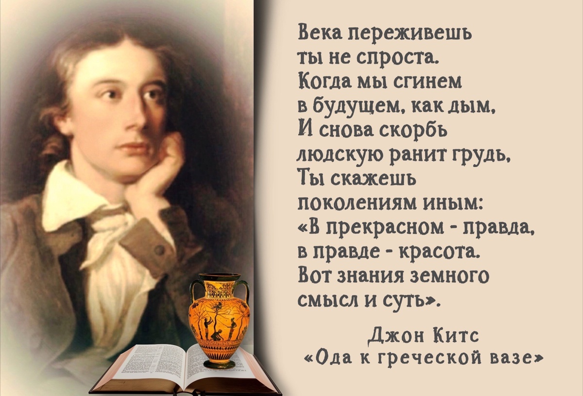 Китс, хотя и происходил из небогатой семьи, получил хорошее образование в закрытой школе, учился на врача. Но, какое там врачевание! Во время проведения важных операций, работая скальпелем, он сочинял стихи и витал в эмпиреях. Доходная медицина без боя уступила место «бездоходному бумагомаранию». Самые первые стихи Китс написал в девятнадцать лет, последние поэтические строки относятся к концу 1819 года. Именно в этот временной промежуток Байрон писал своего «Мазепу»; в далёкой России Пушкин сочинял поэму «Руслан и Людмила», а Карамзин уже напечатал первые тома «Истории государства Российского». Корифеи, всеми признанные и увенчанные лаврами при жизни. У Джона Китса другая судьба: из напечатанных трёх сборников стихотворений продали всего двести экземпляров. Журнальные критики не воспринимали его творения всерьёз, считая поэта необразованным выходцем из низов, который просто обязан знать своё, определенное ему, место в жизни и прямо отсылали его в аптекарскую лавочку готовить пластыри: «Лучше и мудрее быть голодным аптекарем, чем голодным поэтом, так что возвращайтесь назад в свою лавку, мистер Джон, к своим пластырям, пилюлям и баночкам с притираниями…».