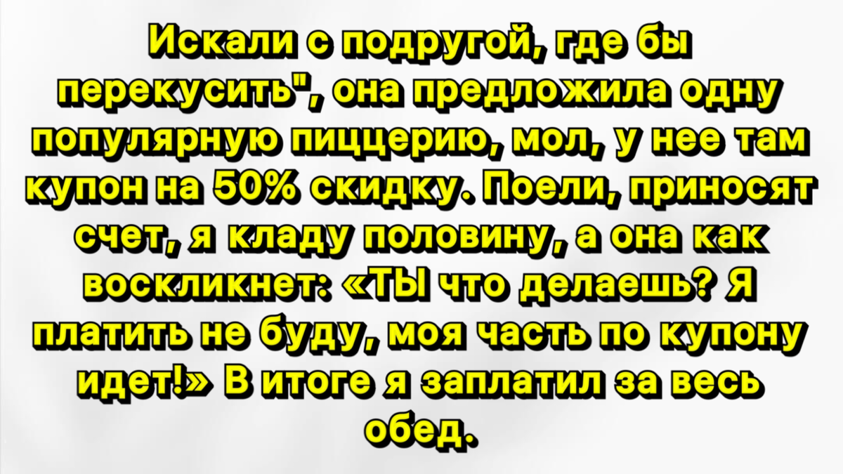 Познакомился с девушкой, пригласил в кафе. Счёт составил чуть больше 11 долларов, а у меня как раз 11 наличными. Попросил у неё 50 центов добавить. Отвёз её домой, а на следующий день получил гневное сообщение с требованием вернуть долг!