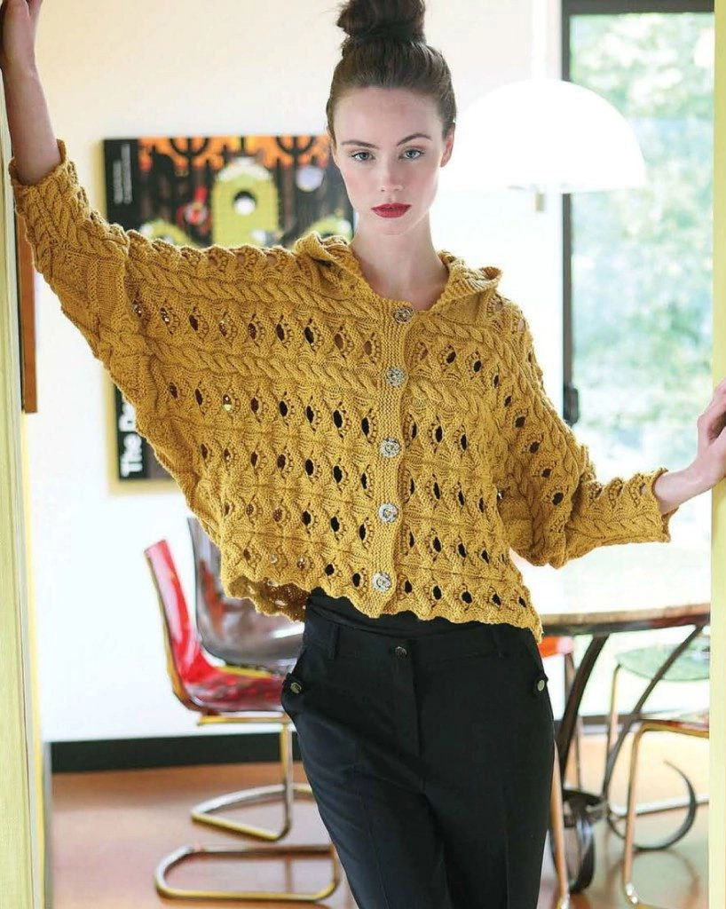 Для вечернего образа можно выбрать ажурный жакет из тонкой пряжи, наброшенный на плечи поверх шелкового платья. Эта элегантная комбинация создает романтичное настроение и подходит для свидания, ужина в ресторане или театрального вечера. Дополните образ изящными аксессуарами и туфлями на каблуке — и вы будете неотразимы.
