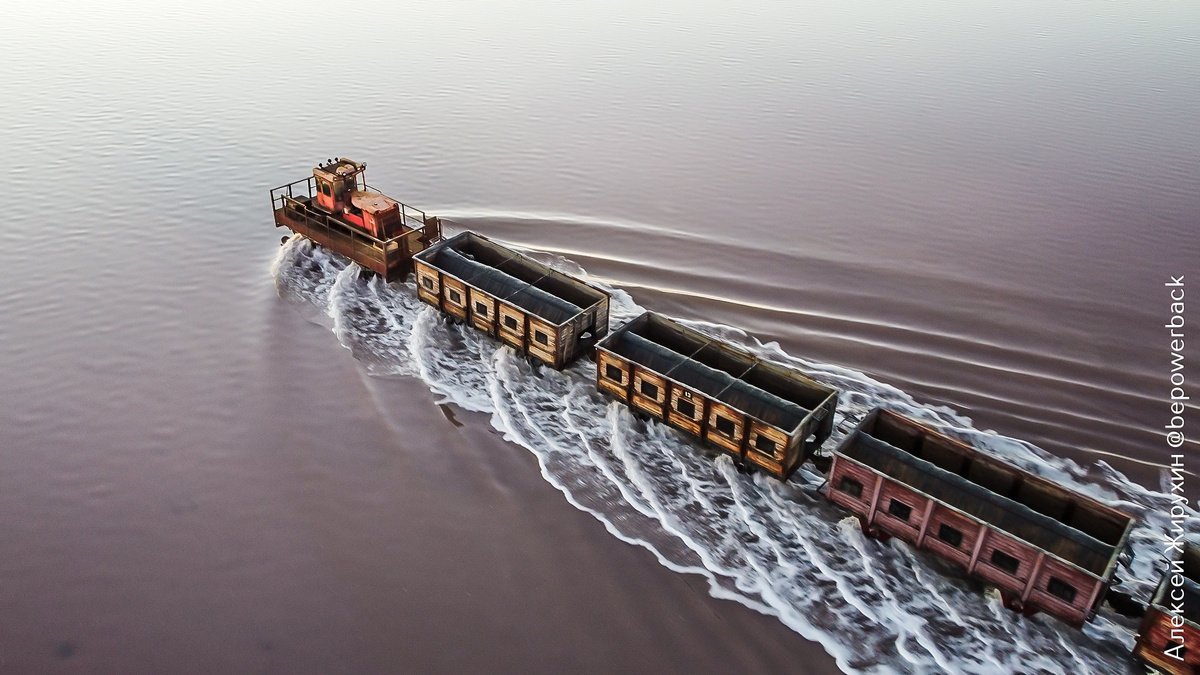 Технология, придуманная еще в советское время, поражает своей простотой и эффективностью. Рельсы уложены прямо на соляное дно. Локомотив - это обычный трактор, поставленный на железнодорожную платформу. Солекомбайн рыхлит соляной пласт, а поезд грузит его в вагонетки и везет на берег.