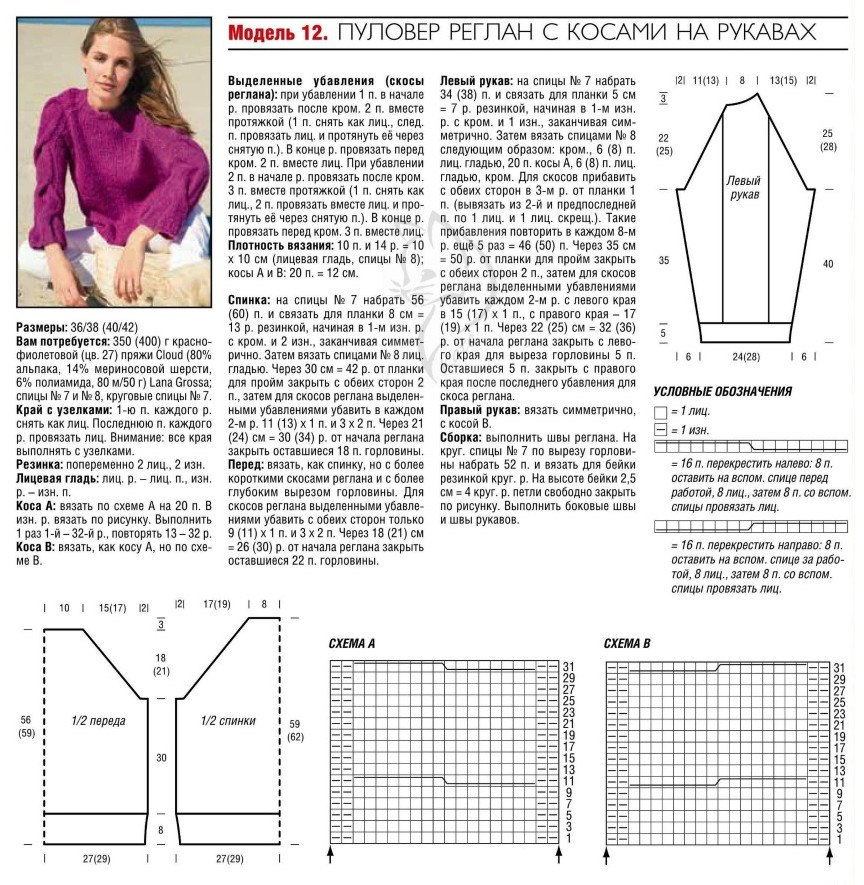 Кофта регланом узором сверху спицами выглядит особенно эффектно, когда узор продолжается от горловины через все изделие. Для таких моделей лучше выбирать не слишком сложные повторяющиеся узоры, которые легко адаптировать под регланные линии.