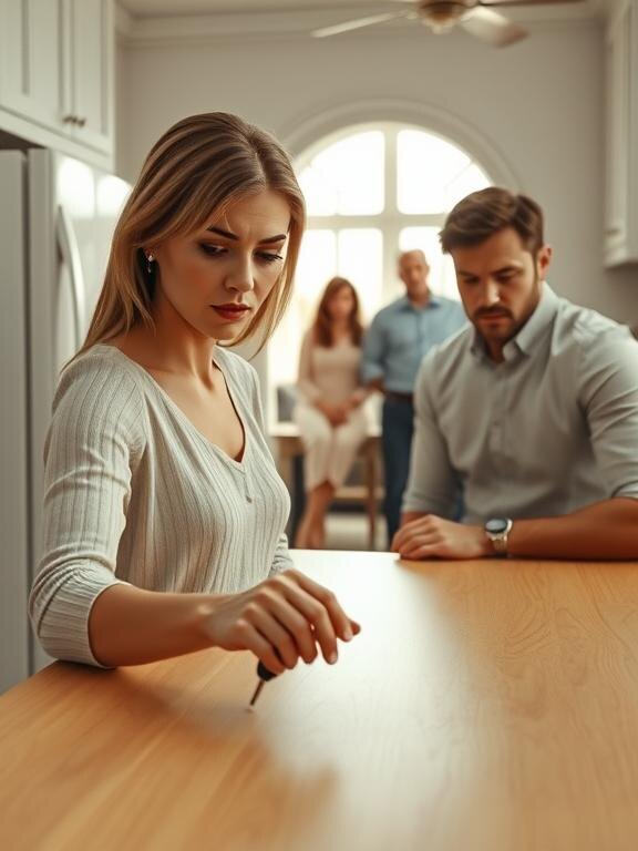 Лена стояла, опершись руками о стол. На лице — смесь обиды и горечи.