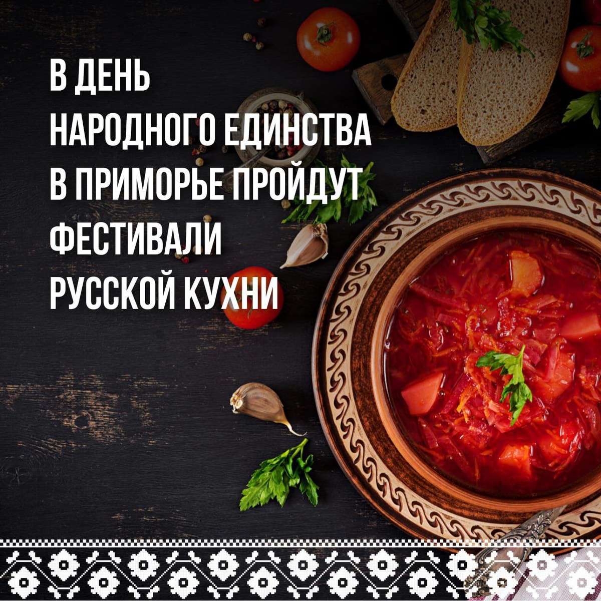 🇷🇺 В Приморье отпразднуют День народного единства Откроет праздничную программу столица края – здесь уже сегодня на площадке перед Национальным центром «Россия» стартует фестиваль «Русский мир». 🍭 Гостей ждет концертная программа, народные ярмарки, дегустация блюд русской кухни, мастер-классы и игры. 🥧 Русская кухня — богатое наследие страны, но лишь около 1% ресторанов в России позиционируют себя как рестораны русской кухни. В ближайшее время разрабатывается стандарт для ресторанов, создающих блюда русской кухни. А чтобы популяризировать русскую кухню, в День народного единства по всей стране будут организованы фестивали русской кухни. 👕 4 ноября в муниципалитетах Приморья пройдут праздничные мероприятия, где можно будет узнать больше о традициях и культуре народов России, а также попробовать блюда русской кухни.