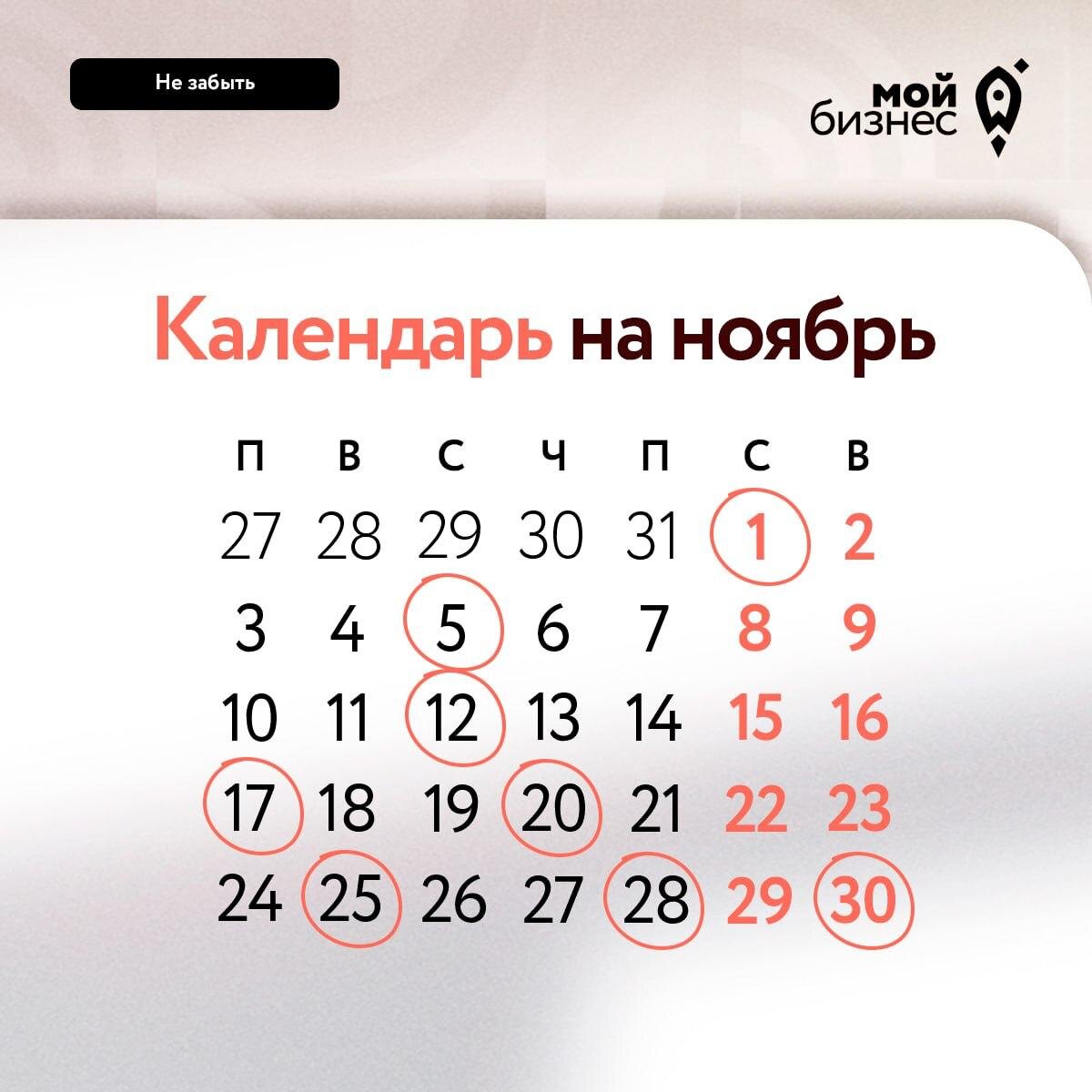 ❓О чём не забыть в ноябре❓ В ноябре предпринимателям предстоит традиционно сдать отчетность, отправить уведомления и произвести обязательные платежи — налоги, авансы, страховые взносы и НДС. Кроме того, с 1 ноября вступают в силу важные изменения: 1️⃣ Долги по налогам у самозанятых и физ.лиц смогут списываться без суда 2️⃣ ФНС больше не принимает обращения через операторов ЭДО 3️⃣ Сотовые операторы начнут блокировать неподтвержденных абонентов 4️⃣ Изменения в маркировке ряда товаров 👉 Для удобства подготовили «Календарь предпринимателя» на ноябрь — смотрите его на нашем портале. #Мойбизнес_оважном 📱 Мой бизнес_65: всё для самозанятых и малого бизнеса