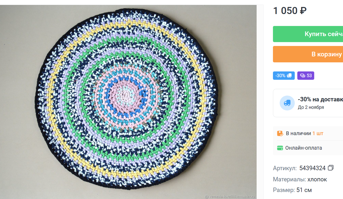 Ну и чтобы расставить все точки над I, давайте заглянем на Ярмарку мастеров и посмотрим, сколько там стоит простой деревенский коврик-кругляш.