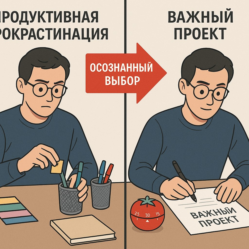 Враг продуктивности №1: как прокрастинация маскируется под работу (и что с этим делать) Вы знаете это чувство: вроде бы весь день занят, дел переделано куча, а самое важное так и лежит нетронутым? Поздравляю, вы стали жертвой «продуктивной» прокрастинации. Это не когда ты просто смотришь сериалы, а когда с упоением моешь посуду, раскладываешь папки на компьютере или отвечаешь на старые письма, лишь бы не браться за тот самый один проект. Я провел над собой эксперимент и нашел способы бороться с этим хитрым врагом. Что такое «продуктивная» прокрастинация и почему она опасна? Это самообман высшей пробы. Ваш мозг, чтобы избежать дискомфорта от сложной задачи, находит кучу мелких, неважных, но СРОЧНЫХ дел. Вы чувствуете себя полезным, ставите галочки, но по факту стоите на месте. Опасность в том, что вы теряете самое ценное — время, необходимое для качественного рывка. Почему мы это делаем? Три главные причины: 1. Страх неудачи (или успеха). А что, если я не справлюсь? А что, если это