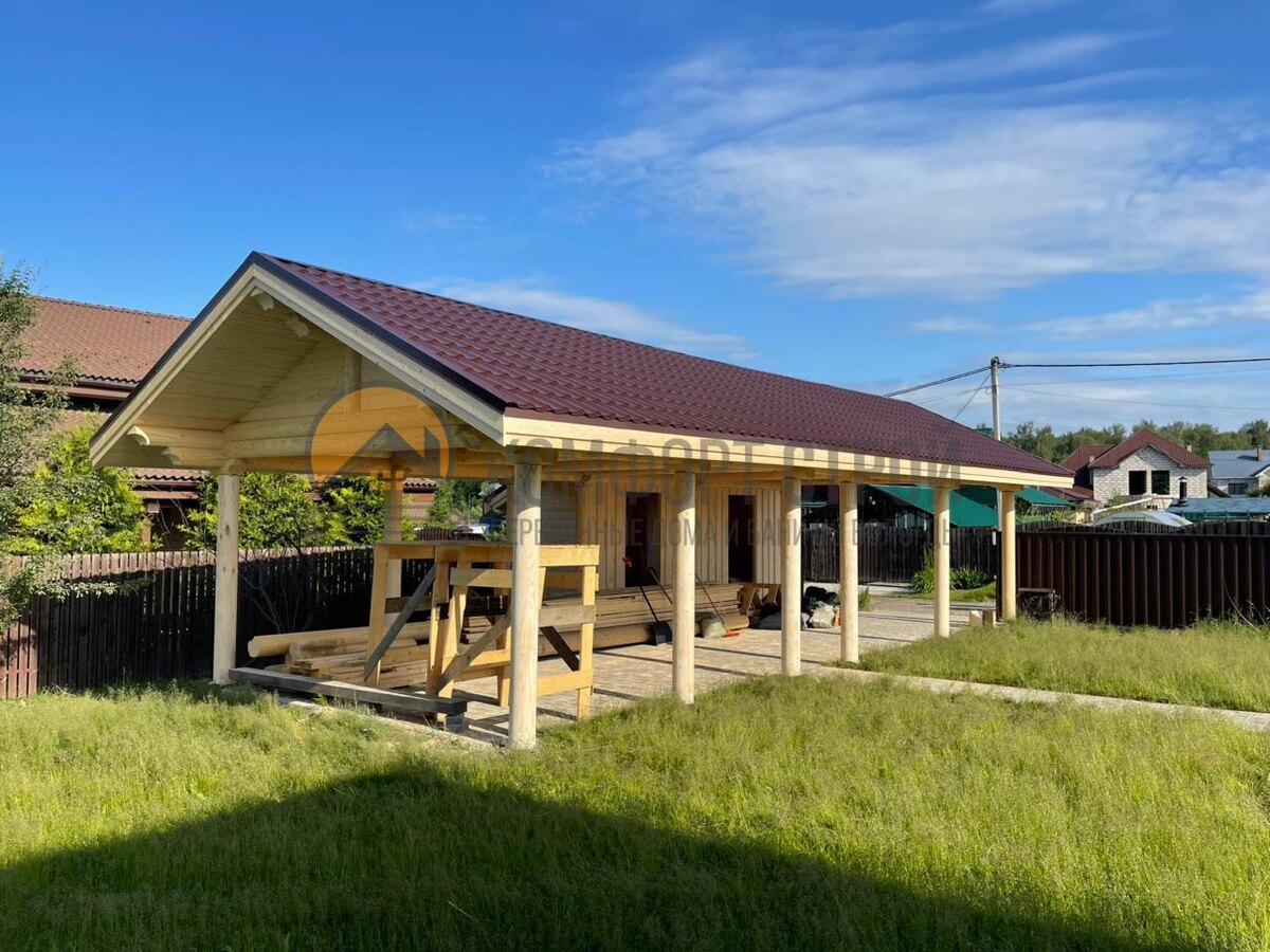 Навес под 2 автомобиля с хоз.блоком. Материал: оцилиндрованное бревно д. 220 мм, Размер: 14 х 5 метров Место строительства: Московская область, Дмитровский район Навесы для автомобилей и хозяйственные блоки из оцилиндрованного бревна обладают рядом уникальных преимуществ, которые делают их не только функциональными, но и эстетически привлекательными. Навес для автомобиля не только защищает транспортное средство от осадков и солнечных лучей, но и может служить дополнительной зоной хранения. Хоз.блок — идеальное место для хранения садового инвентаря, инструментов, зимней резины и других бытовых предметов. Выбирая оцилиндрованное бревно для строительства навеса, вы получаете гармоничное сочетание функциональности, надежности и природной красоты. Сможем сделать в любом исполнении. Хотите узнать стоимость навеса, ставьте «+», рядом с «+», пишите регион доставки! Записывайтесь на экскурсию на строящиеся объекты. +7 (911) 511-34-72 — Александр