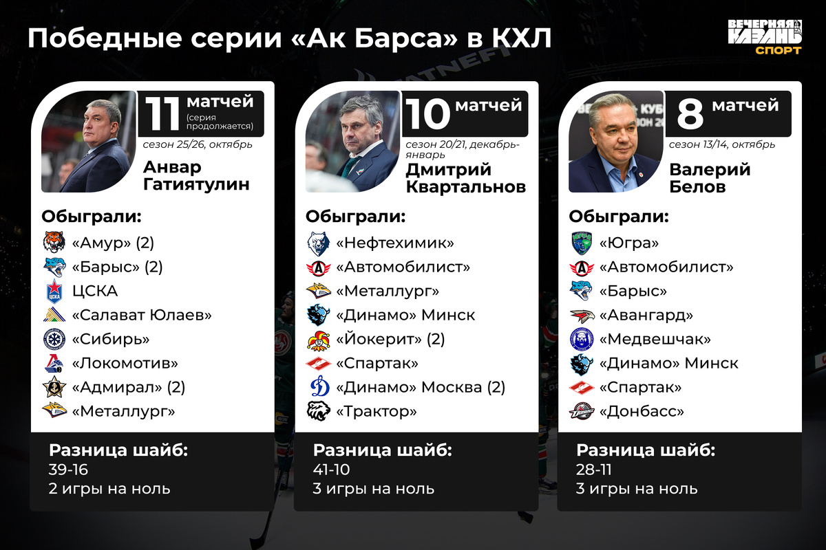 В 2021 году Дмитрием Квартальновым было одержано десять побед подряд. На отрезке декабрь-январь были обыграны: «Трактор», «Металлург», «Динамо» Москва (дважды) и другие. Достижение нынешнего наставника минского «Динамо» держалось долгие четыре года, пока не пришел Гатиятулин. Примечательно, что серии Белова и Билялетдинова (16-17) выпали, как и в случае Анвара Рафаиловича, на октябрь. Однако никаких споров быть не может - Гатиятулин провел лучший октябрь из возможных.