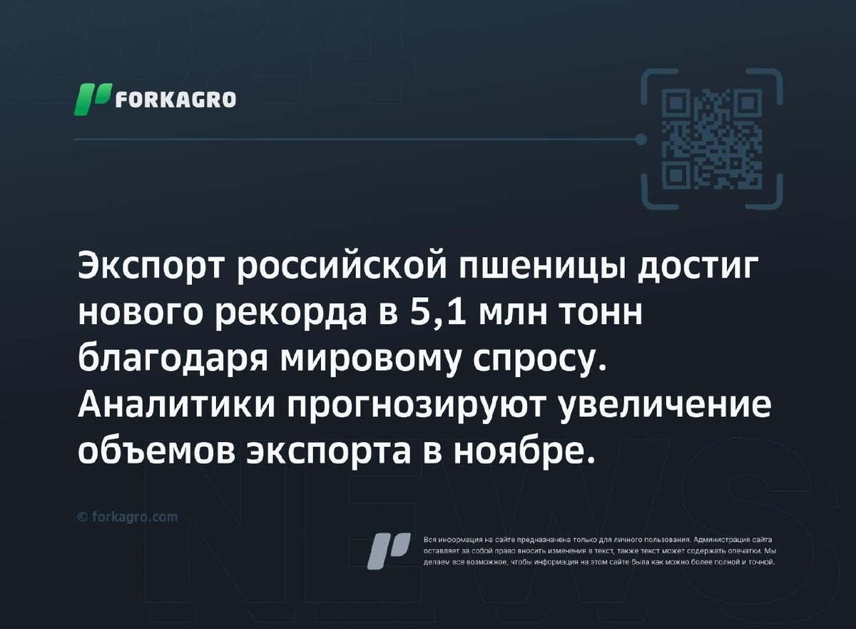 Экспорт российской пшеницы достиг нового рекорда в 5,1 млн тонн благодаря мировому спросу. Аналитики прогнозируют увеличение объемов экспорта в ноябре. Экспорт российской пшеницы в октябре достиг 5,1 млн т, превысив прогнозы. Ведущими импортёрами стали Египет и Турция. Украина и ЕС также сократили объемы экспорта. Маржа экспортеров возросла до $4/т, но погодные условия в Черном море могут стать угрозой. Прогнозируется, что объем экспорта в ноябре составит от 4,6 до 5 млн т. Перейти к источнику