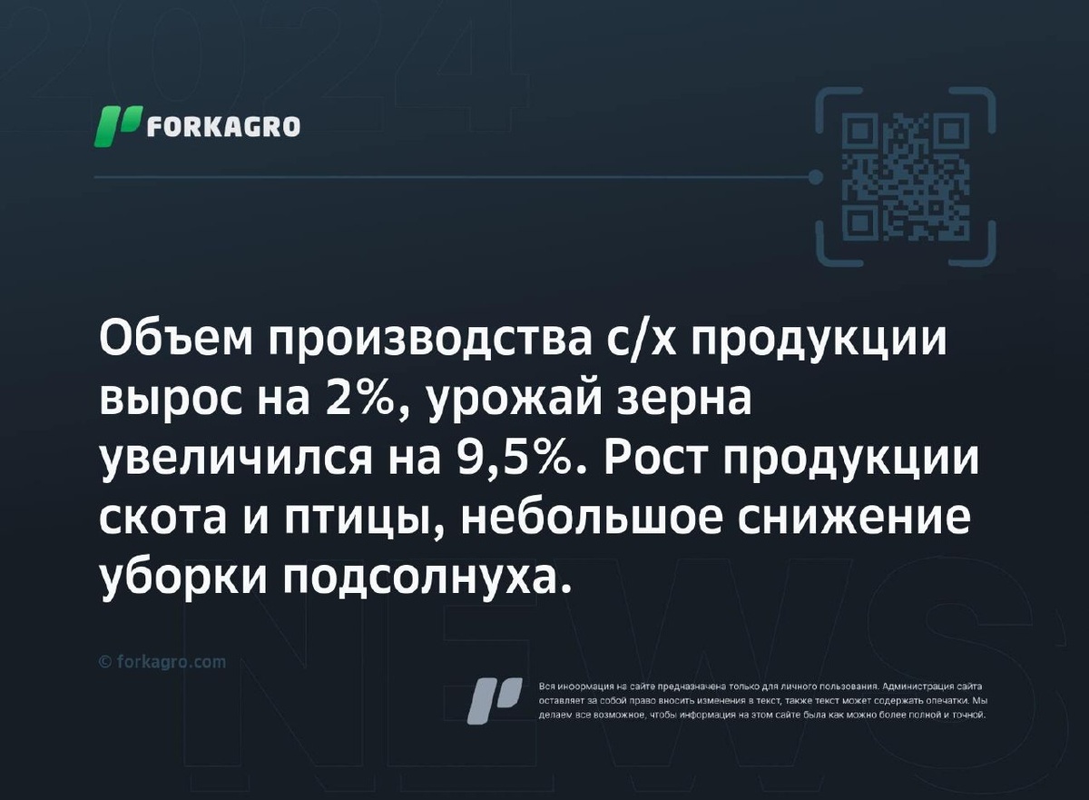 Объем производства с/х продукции вырос на 2%, урожай зерна увеличился на 9,5%. Рост продукции скота и птицы, небольшое снижение уборки подсолнуха. Согласно данным Росстата, объем производства сельскохозяйственной продукции в 2024 году вырос на 2%, достигнув 8,24 трлн рублей. Урожай зерна увеличился на 9,5%, сахарной свеклы — на 12,9%, а подсолнечника — снизился на 9,9%. Производство скота и птицы увеличилось на 0,3%, молока — на 0,3%, яиц — на 4,4%. Реализация зерна снизилась на 18,9%, но продажи скота, молока и яиц увеличились. Перейти к источнику