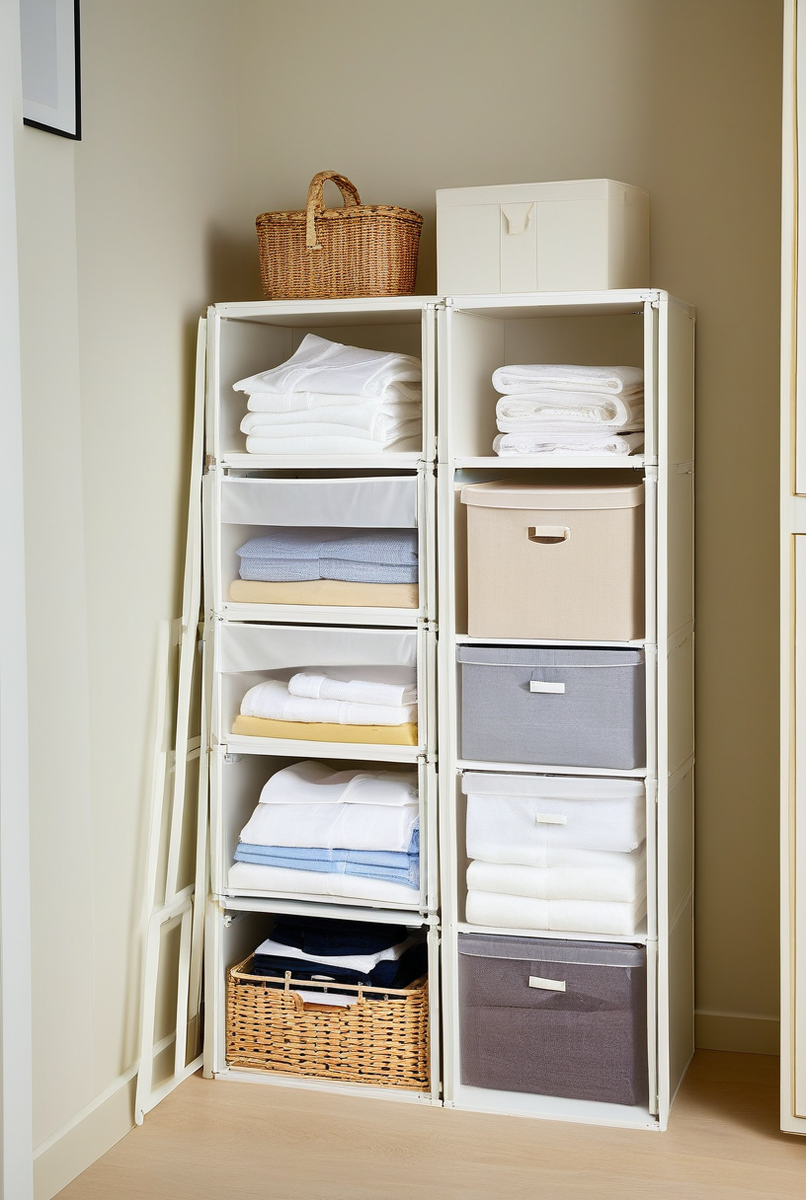 Вертикальное хранение — это главный секрет экономии места. Используйте подвесной модуль с несколькими полками — это готовый органайзер для шкафа. Также составляйте набор коробок или контейнеров друг на друга. Для этого лучше выбирать модели с крышкой и жесткими стенками. Убедитесь, что у них есть удобные ручки для легкого доступа.