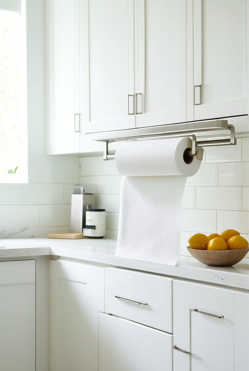- Горизонтальный под шкаф. Этот вариант экономит пространство, что бесценно в небольших помещениях. Рулонные полотенца располагаются прямо над рабочей зоной, не загромождая её. Держатель, спрятанный под шкаф, делает интерьер более аккуратным и минималистичным.