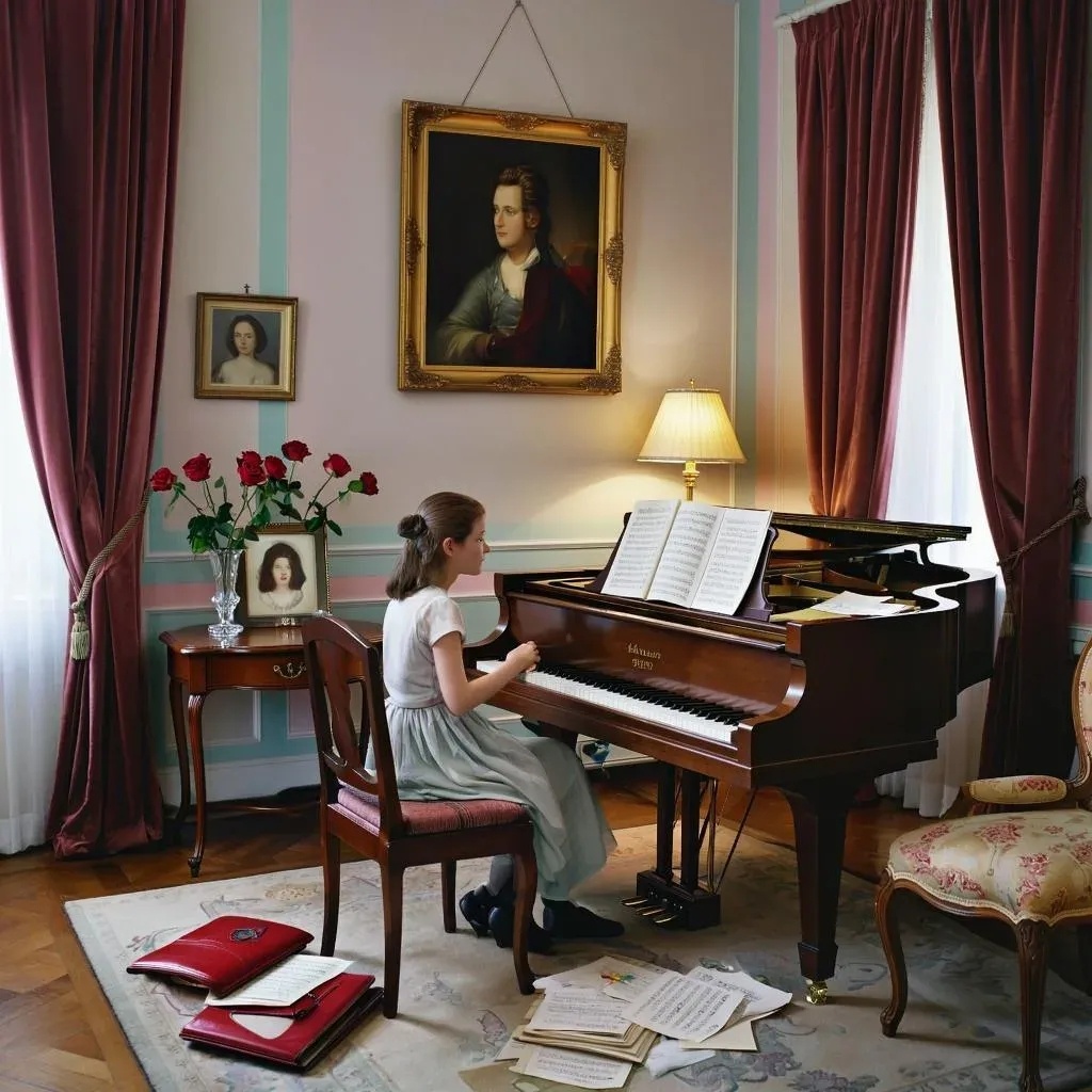 Квартира Сергея: на столах лежат ноты, а в комнате открыто пианино, за ним сидит дочь, а над пианино портрет Глинки, на столе около пианино стоят алые розы, а около них портрет жены, окна задёрнуты тёмными шторами, над шторами лежит красная папка с нотами