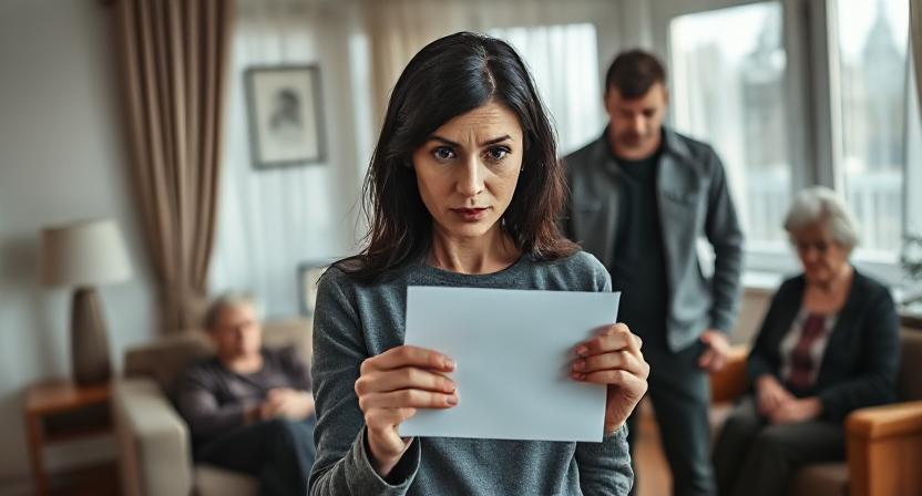 Она открыла дверь, но на пороге остановилась и всё-таки обернулась. Посмотрела на свекровь, которая сидела на диване, сжимая конверт с деньгами. Потом на мужа, который стоял потерянный и растерянный.