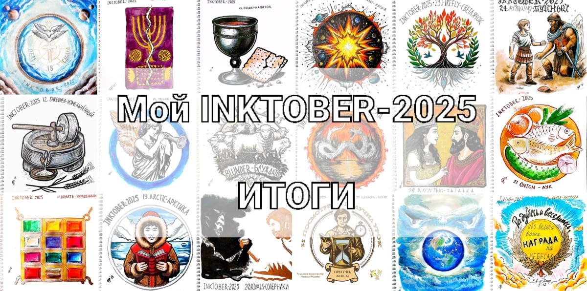 Хочу сразу отметить, что я не планировала участвовать в этом году в Инктобере. Зачем? Что мне это даст? А вот как-то само вышло. И времени хватило, и желания и сил. Ну, а теперь об итогах: 1. Мозоль на пальце 2. Смахнула пыль со своего планшета и пусть за 5 дней, но нарисовала иллюстрацию в диджитал! 3. Смешивала разные техники и материалы: Это трафаретная иллюстрация с последующей доработкой: 4. Во всю нарисовалась тушью - Инктобер же! 5. Прочитав одну из тем - Преисподняя - поняла, что должна освятить этот Инктобер (по возможности) Словом Божьем: 6. Узнав у коллег про возможности Алисы, сделала короткие видео. Когда Алиса артачилась - искала и находила ей альтернативу. - Ну вы видели)) 7. Завела канал на MAX: 8. Нашла ТГ канал, посвящённый Инктоберу. 9. Мои работы публиковались в Инктоберских ТГ и ВК: 10. Подписалась на интересные группы и каналы коллег и несколько из них подписались на меня. 11. Если сравнить работы первого и последнего дня, то думаю, разница очевидна: