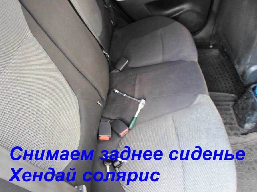 Снимаем заднее сиденье на солярисе хечбек. Легко и просто. Если кому то понадобится снять заднее сиденье на хендай солярисе то это делается легко и просто. А для чего нужно снимать сиденье ? Ну скажем чтобы получить доступ к бензонасосу или чтобы одеть на сиденье чехол , ну и банально снятое сиденье удобнее почистить. Для того чтобы снять заднее сиденье нам понадобится всего лишь головка на 12 с удлинителем. Находим болт который крепит диван к корпусу автомобиля ,он находится ровно посредине под спинкой. Вот здесь. И отворачиваем его Затем берёмся рукой за низ дивана с одной стороны и резко дёргаем его вверх , тоже самое делаем с другой стороны. Всё диван снят и его можно вынести через дверь. Чтобы снять спинки сидений откидываем их и отворачиваем по два болта крепящих спинки к поворотным кронштейнам и вынимаем их. Вот так легко и просто разбирается заднее сиденье хендай солярис хечбек.